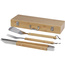 Bambusowy, 3-częściowy zestaw do grillowania z łopatką (42 x 9,5 cm), szczypcami (46 x 2,2 cm) i widelcem (43 x 3,2 cm). Zestaw jest dostarczany w bambusowym pudełku upominkowym (51,5 x 18,2 x 7,2 cm). Uchwyty i pudełko upominkowe są wykonane z bambusa, który jest pozyskiwany i produkowany zgodnie z zasadami zrównoważonego rozwoju.
