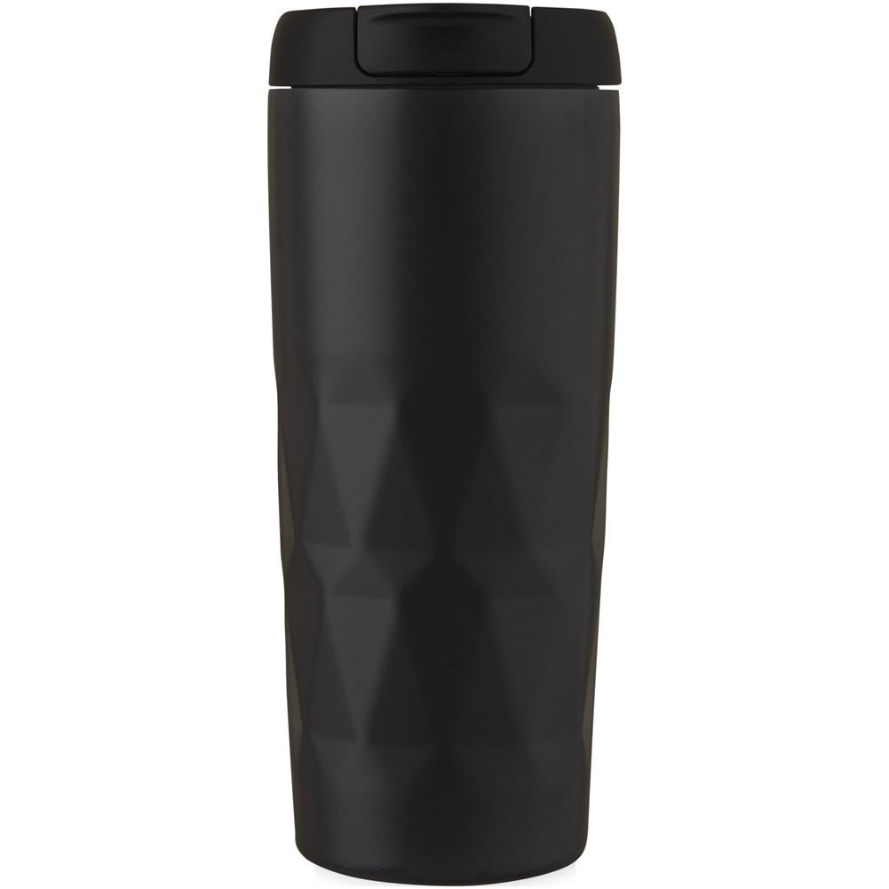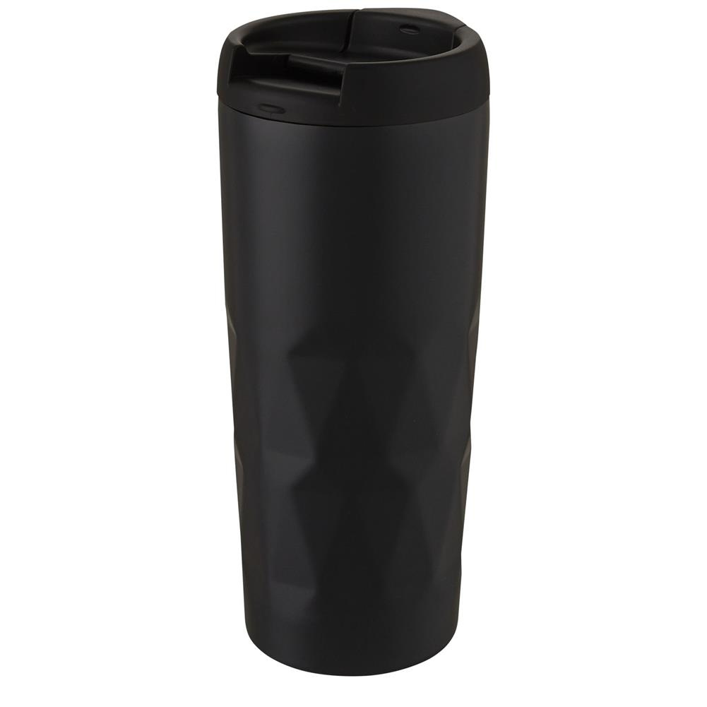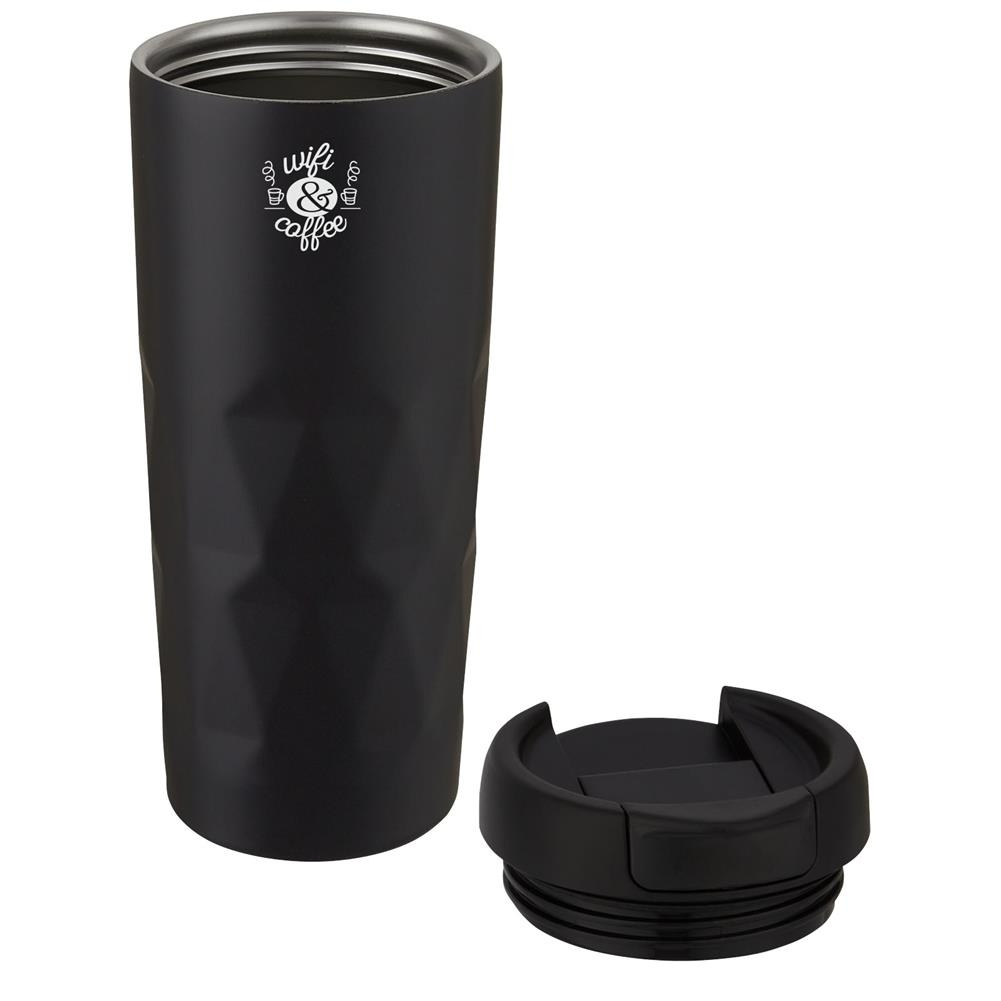 Dwuścienny, miedziany, izolowany próżniowo kubek z zakręcaną, szczelną pokrywką, ozdobiony misternym wzorem geometrycznym.