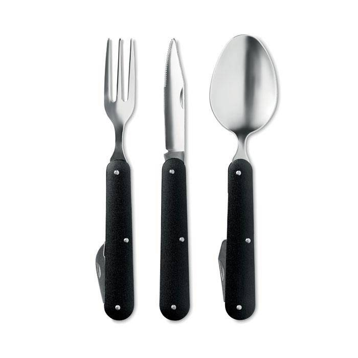 Komplet sztućców kempingowych ze stali nierdzewnej z aluminiowym uchwytem.