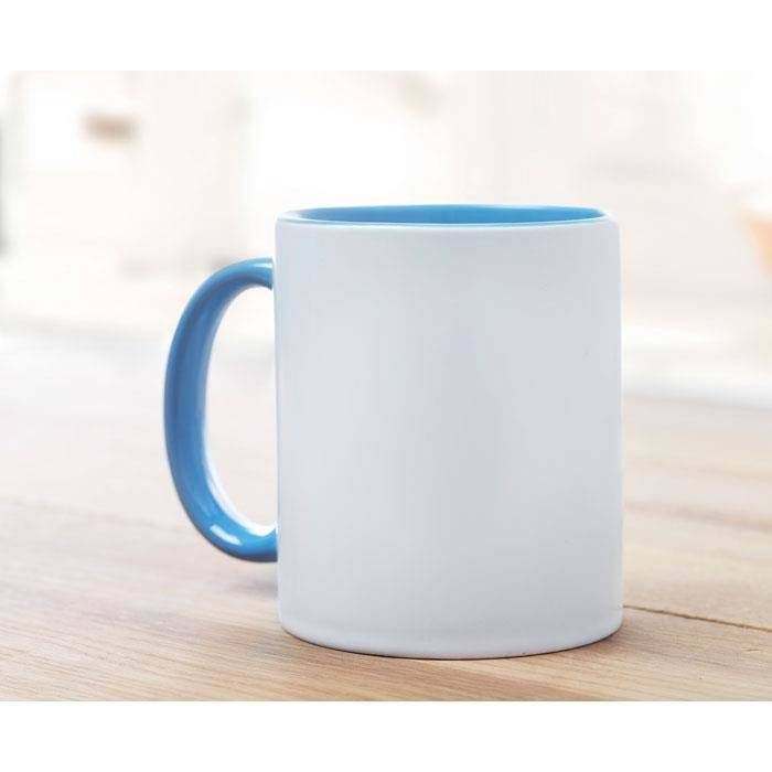 Kubek ceramiczny o pojemności 300 ml pokryty specjalną warstwą pod sublimację, z kolorowym uchwytem i wnętrzem.