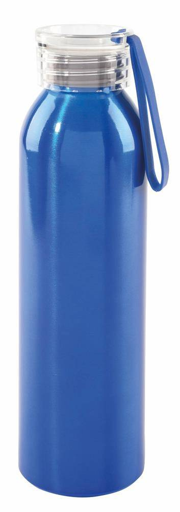 Aluminiowa butelka LOOPED z przezroczystą, plastikową zakrętką z silikonową pętelką. Pojemność ok. 650 ml.