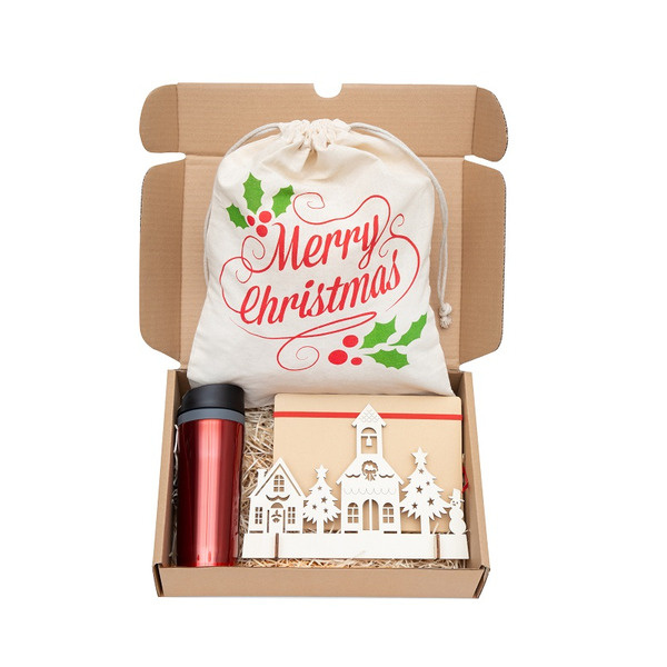 Zestaw upominkowy składający się z bawełnianego worka na prezenty (R22926.13), kubka próżniowego (R08394.82), notesu (R64237.08) oraz drewnianej ozdoby świątecznej (X91021.13). Całość pakowana jest w tekturowe pudełko wyściełane naturalnym wypełniaczem (wełna drzewna). W tekturowym pudełku poszczególne elementy zestawu są w opakowaniach fabrycznych.