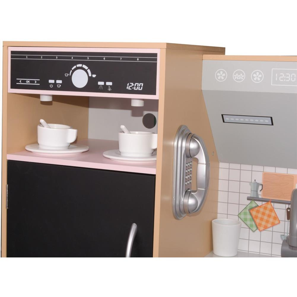 - W zestawie: kuchnia (z namalowaną lodówką, zamrażalką z urządzeniem do lania wody, piekarnikiem, mikrofalówką, palnikiem, ekspresem do kawy, wyciągiem), lampka LED, dwie filiżanki na kawę, kubek na wodę, garnek, patelnia, telefon stacjonarny ze zdejmowana słychawką, zlew, kran, uchwyty, półka do piekarnika.