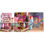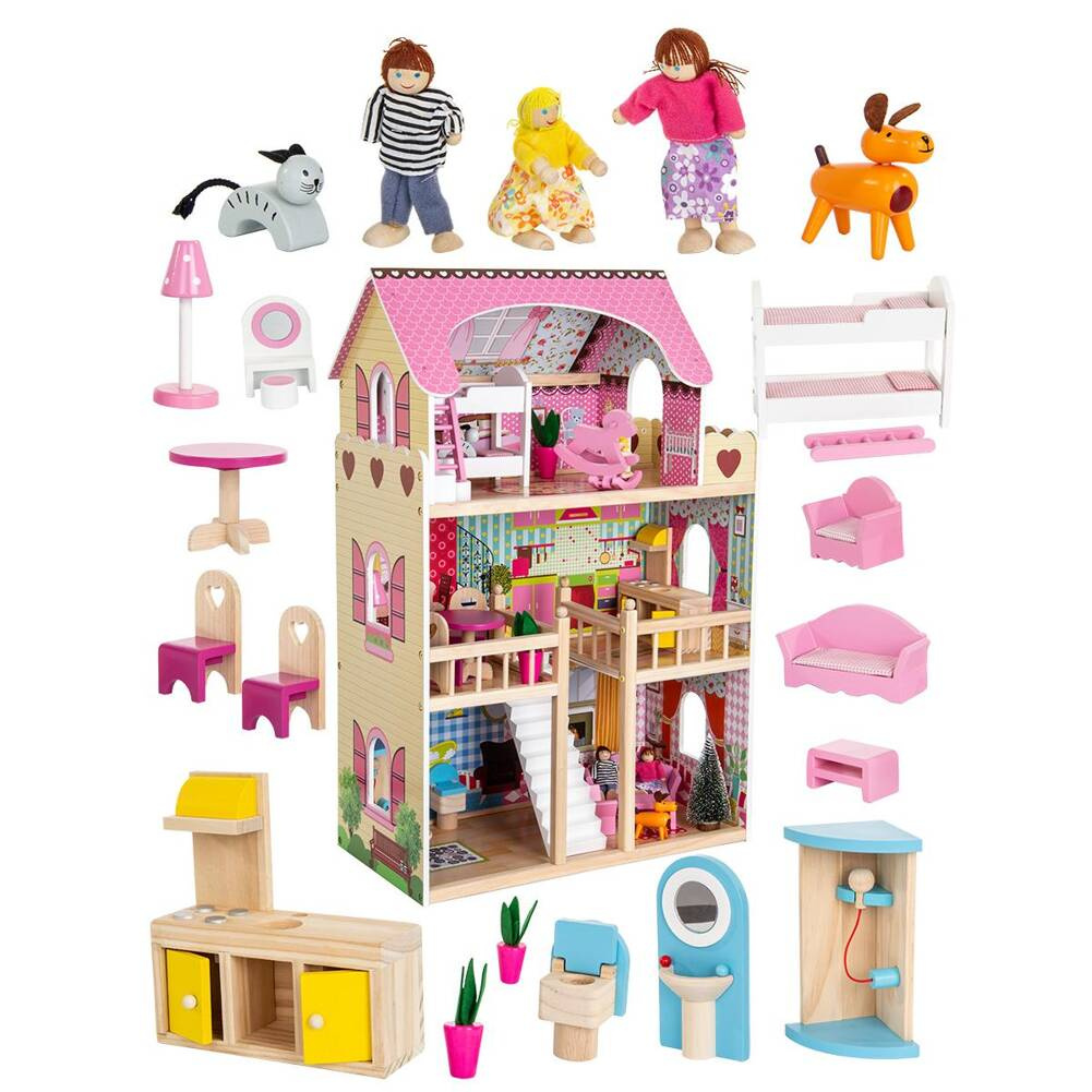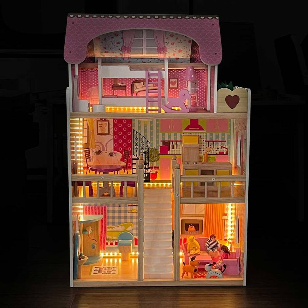 - W skład zestawu wchodzą: domek dla lalek do samodzielnego montażu, 3 m pasek LED, stolik, 2 krzesła, łóżko piętrowe, konik na biegunach, toaletka ze stolikiem, 2 roślinki, 2 lampy, zestaw kuchenny, 2 sofy ze stolikiem na kawę, zestaw łazienkowy, toaleta, umywalka, 3 lalki, choinka, pies, kot