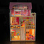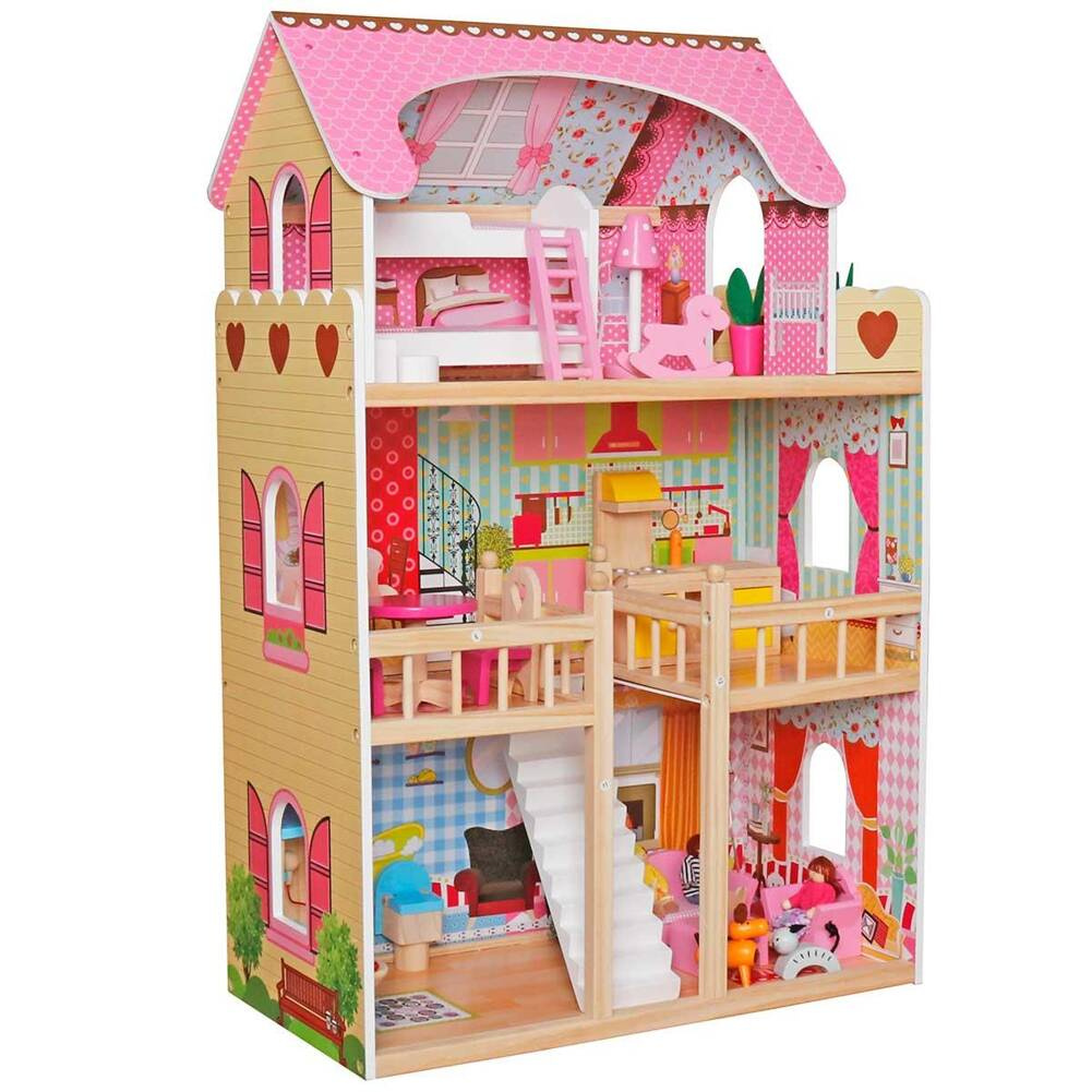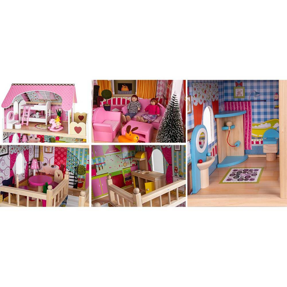 W każdym pomieszczeniu tego ślicznego drewnianego domku znajduje się okno, przez które wpada światło i przez które można zaglądać do środka. Na kolorowych ścianach namalowane są rozmaite przedmioty i elementy uzupełniające wyposażenie pokoi, a elewacja domu ozdobiona jest w rozmaite kolorowe kwiaty, płotek, lampy, a przy oknach namalowane zostały piękne okiennice . Całość z pewnością spełni oczekiwania i marzenia każdego, kto marzył o własnym domku dla lalek.