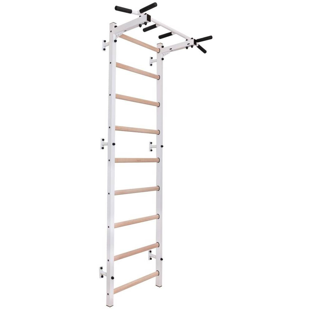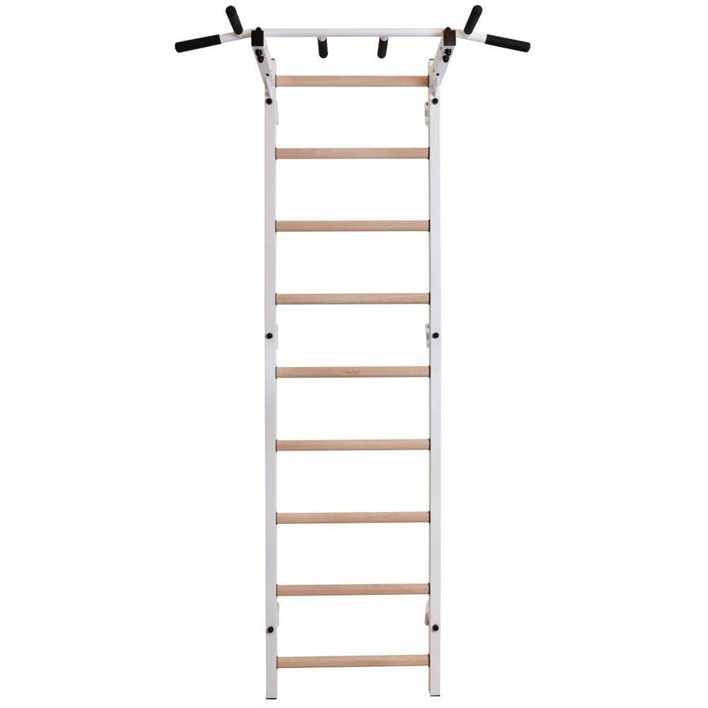Drabinka gimnastyczna to model, który idealnie pasuje do skandynawskiego stylu wnętrz. Pionowe profile (40mm x 50 mm) wykonane są z wysokiej jakości metalu pomalowanego proszkowo. Szczebelki są wykonane z buku o owalnym kształcie, powierzchnia szczebelków jestb olejowana ręcznie, to wszystko wpływa na to, że użytkowanie drabinki jest komfortowe. W górnej części drabinki znajduje się montowany na stałe metalowy drążek do podciągania, który wyposażony jest w 6 różnych rączek pozwalających pracować nad siłą mięśni ramion i pleców za pomocą różnych chwytów, np. chwytem szerokim. Długość drążka do podciągania to 115 cm.