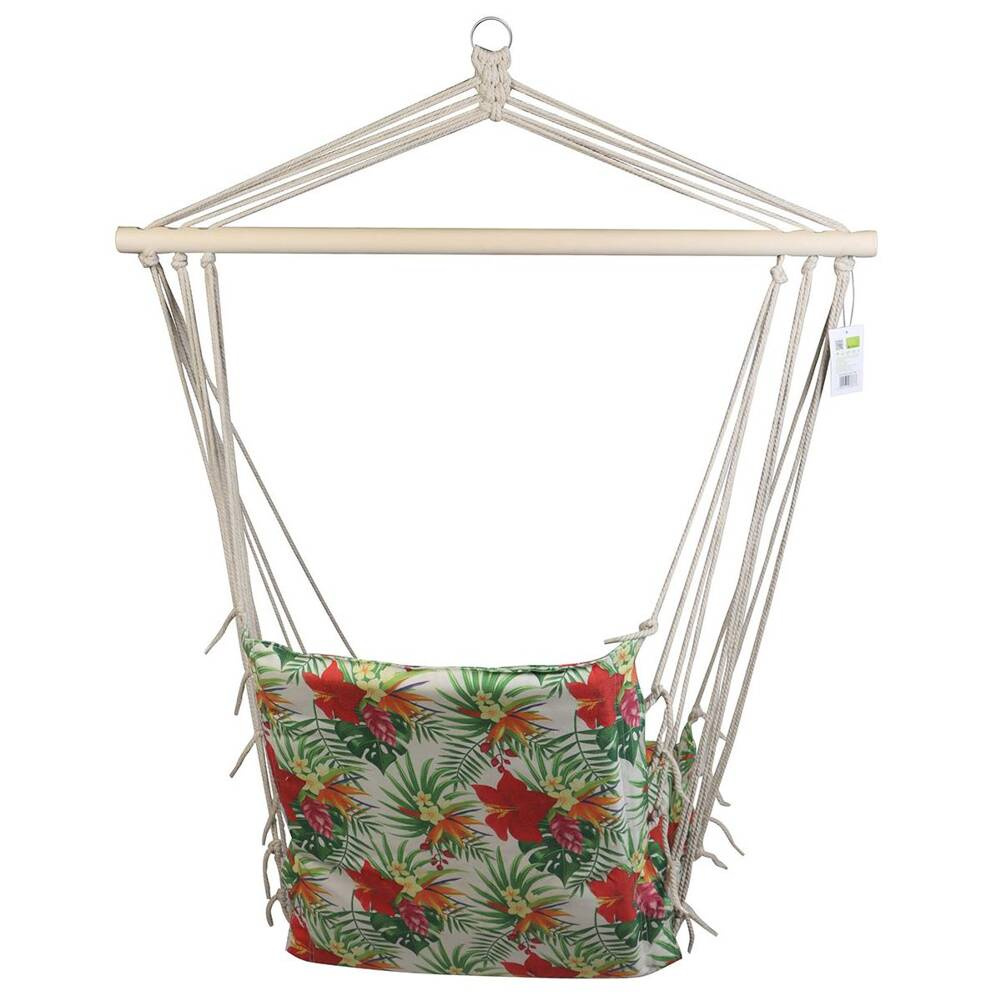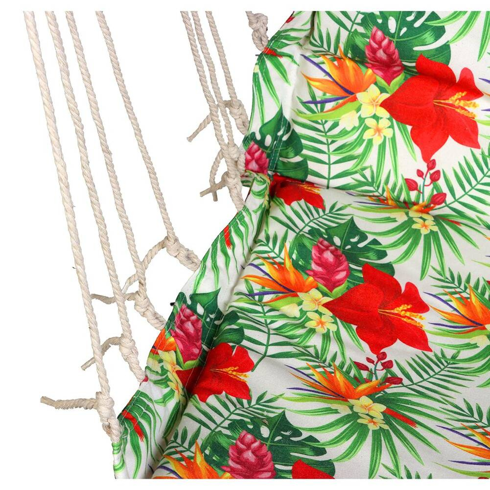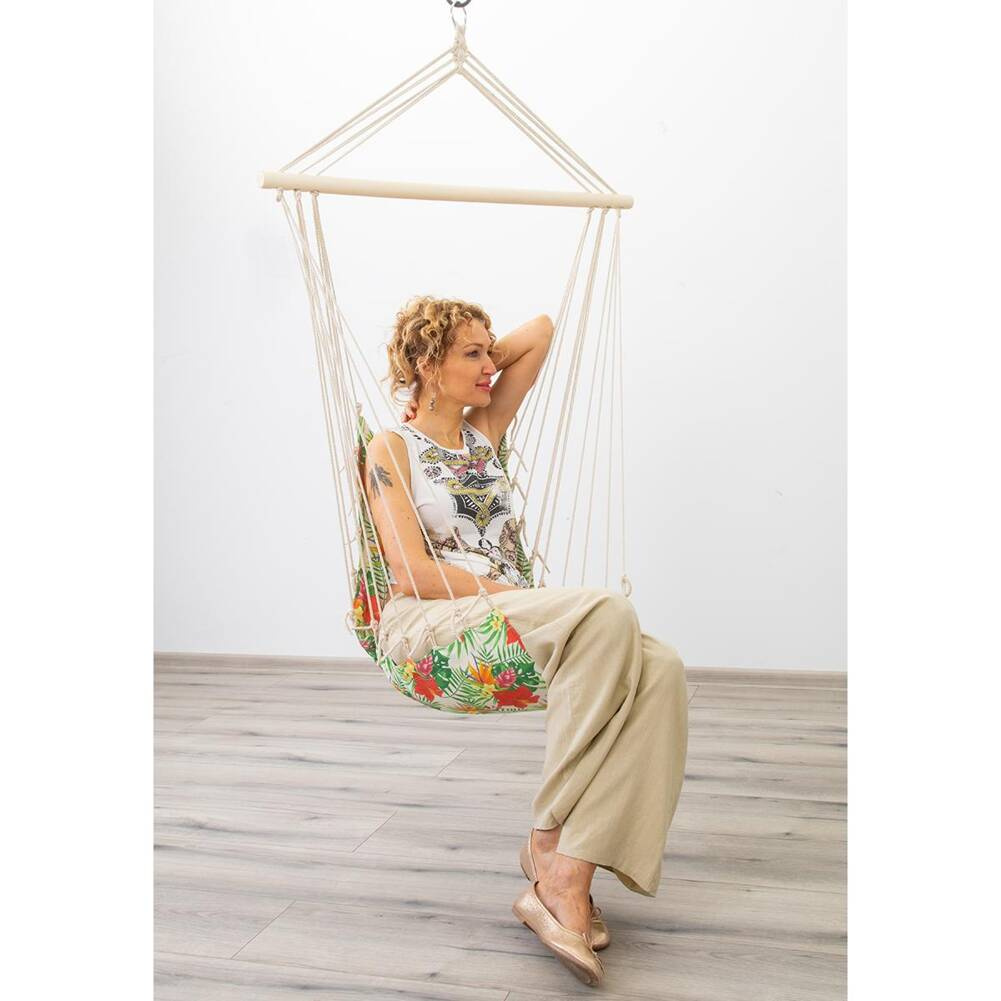 HAMAK FOTEL FISZĄCY BRAZYLIJSKI NATURA TROPIC JUNGLE to doskonały wybór na leniwe, letnie popołudnie w ogrodzie i nie tylko, możesz z niego korzystać również w domu na tarasie lub balkonie. Wystarczy zamontować odpowiedni hak podpiąć hamak i rozpocząć relaks. Wysokiej jakości materiał, wszyte w oparcie i siedzenie poduszki z pianki i solidna konstrukcja, o nośności do 120 kg zapewnią Ci bezpieczeństwo oraz niezwykłą wygodę. Wypoczywaj na całego w naszym wygodnym i stabilnym hamaku fotelu brazylijskim. Zamień kawałek ogrodu lub tarasu w oazę ciszy i spokoju, bo tym hamakiem, relaks na świeżym powietrzu to czysta przyjemność!
