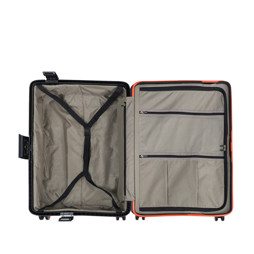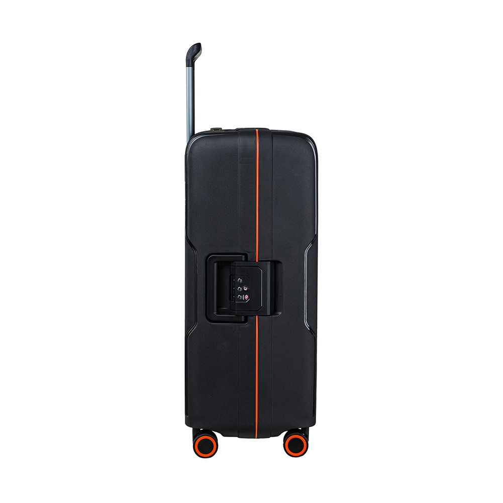 - walizka twarda wykonana z polipropylenu, materiału charakteryzującego się super lekką wagą i niezwykłą wytrzymałością