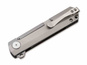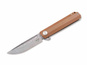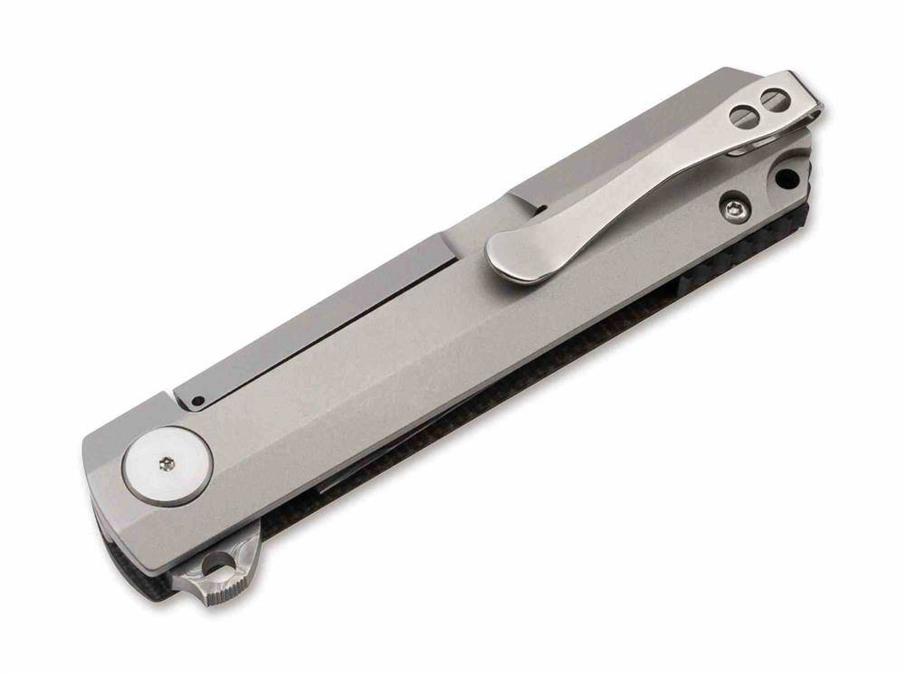 Jako połączenie nowoczesnego EDC i wysokiej jakości noża dżentelmeńskiego, Boker Plus Cataclyst przekonuje również w wariancie Damasceńskim ze 110 warstwami na całej linii. Solidne ostrze otwiera się na łożyskach kulkowych za pomocą flipera i ma płaski szlif i rowek po obu stronach. Jest utrzymywany w pozycji otwartej przez mechanizm flipjoint, który nie blokuje ostrza. Prostoliniowa konstrukcja wyposażona jest w chwyt przedni wykonany z trójwymiarowo frezowanej Micarty, który wykończony jest w kolorze jasnego brązu. Metalowa skala i klips do przenoszenia (tip-up/r), który jest również trójwymiarowo wyfrezowany z bryły, mają satynowe wykończenie. Wyposażony w otwór na smycz i wysokiej jakości nylonową pochwę do przechowywania.