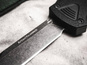 Ciemne ostrze stonewash jest wykonane ze stali nierdzewnej D2 i można je wygodnie obsługiwać za pomocą suwaka z tyłu rękojeści.