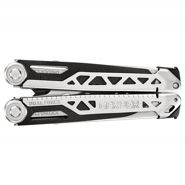 Multitool Gerber Dual-Force to jedyny multitool na rynku oferujący dwupozycyjną blokadę kleszczy i duże zęby zapewniające pewny chwyt i kontrolę. Śrubokręt z wymiennymi bitami umieszczony w osi narzędzia gwarantuje maksymalny moment obrotowy. Rękojeść multitoola jest o 47% węższa względem narzędzi konkurencji co sprawia, że chwyt jest pewny.