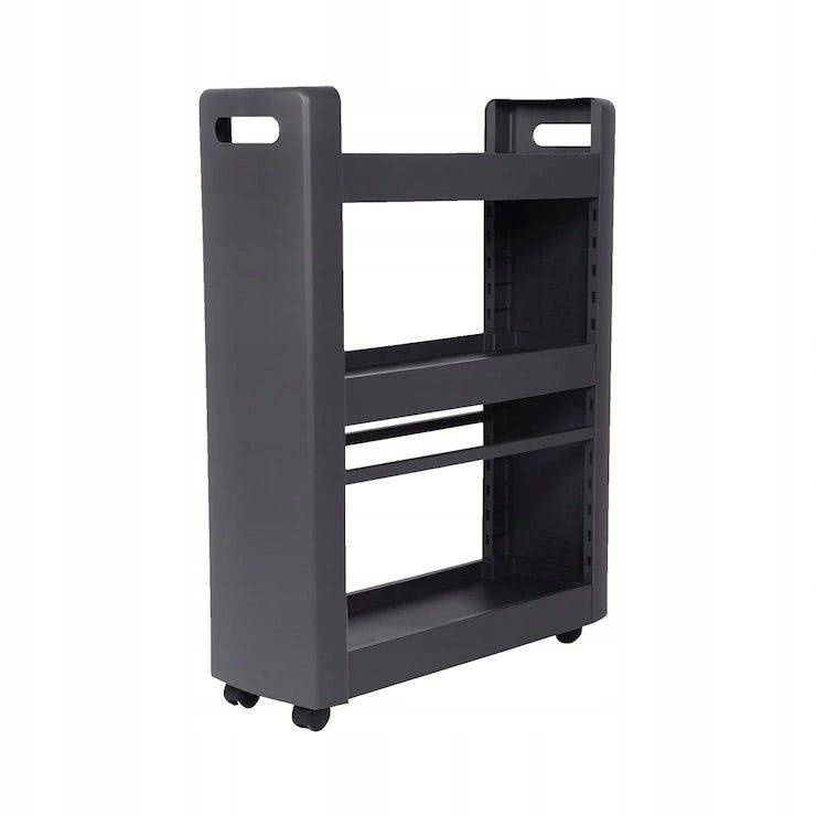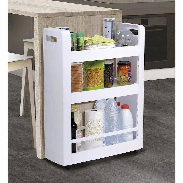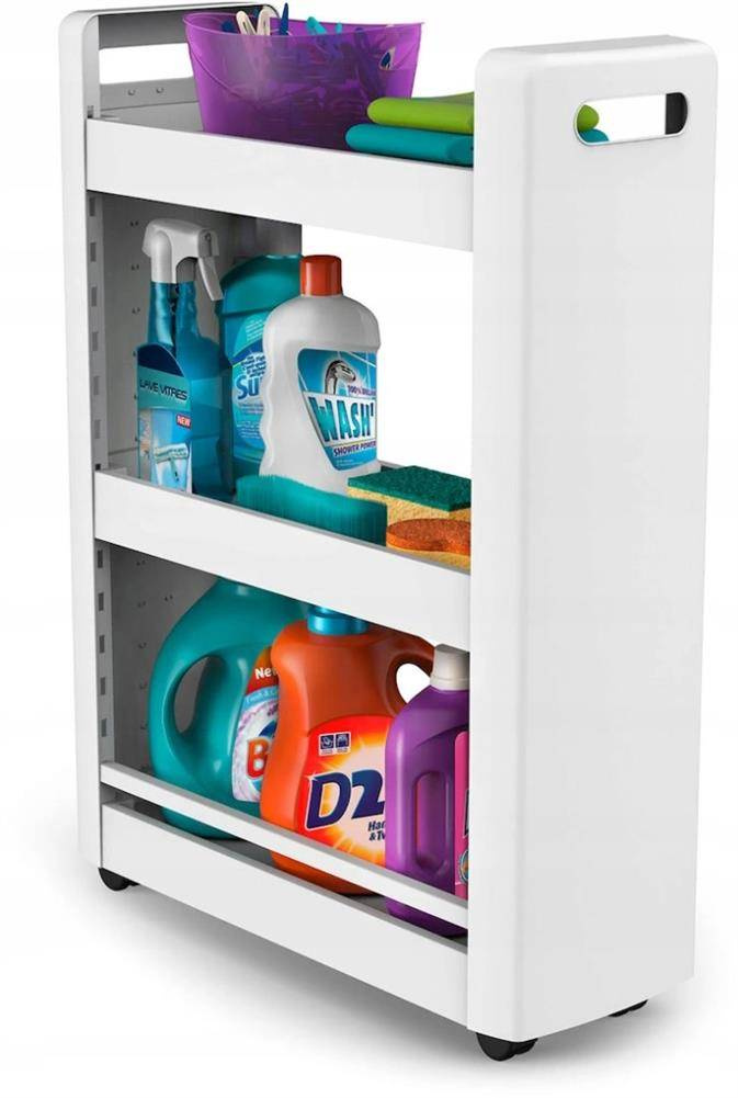 Uniwersalna i wielofunkcyjna szafka na kółkach, zmieści się nawet na bardzo małej przestrzeni, zapewniając dodatkowe miejsce do przechowywania. Pozwala na maksymalne zagospodarowanie małego pomieszczenia, jednocześnie umożliwia wygodny dostęp do przechowywanych przedmiotów. Można ją ustawić między meblami lub tam gdzie mamy mało miejsca. Idealnie nadaje się do małej łazienki, na półkach z łatwością można ułożyć wszelkie kosmetyki lub detergenty. Ułatwia zagospodarowanie niewykorzystanej lub nieustawnej przestrzeni w kuchni, można wstawić ją między szafki lub schować pod stołem, wówczas na półkach bez problemu zmieszczą się puszki, butelki, przybory do gotowania lub książki kucharskie. Szafka posiada 4 kółka, które ułatwiają przesuwanie. Biały kolor oraz prosty wzór sprawią, że pasuje do większości wnętrz, dzięki swojej prostocie zajmuje mało miejsca. Łatwa montaż, bez narzędzi Dowolna regulacja półek Obrotowe kółka Wymiary szafki przystosowane do wstawiania pod powierzchnię roboczą o wysokości 80 cm Szerokie półki, zmieszczą się obok siebie 2 butelki 1,5L Kolor: biały, czarne kółka Wymiary: 79,0 cm x 60,0 cm x 22,0 cm Materiał: polipropylen