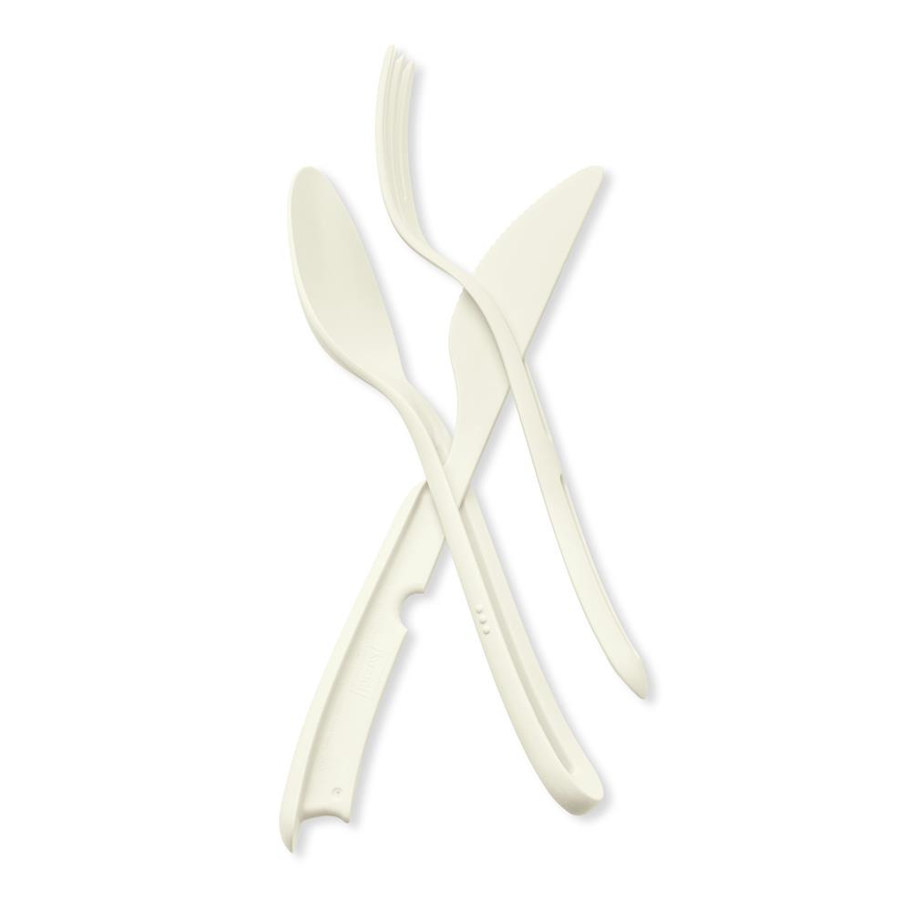 Komplet zawiera łyżkę, nóż i widelec, unikatowa konstrukcja pozwala łatwe i szybkie złożenie poszczególnych elementów w set.