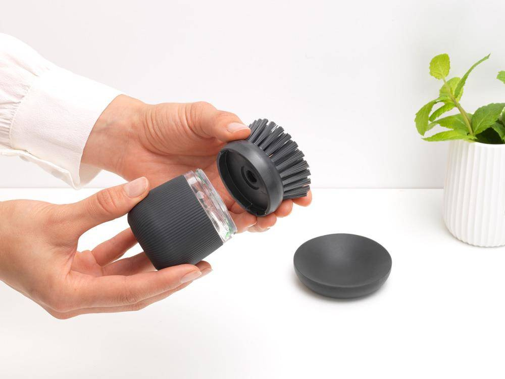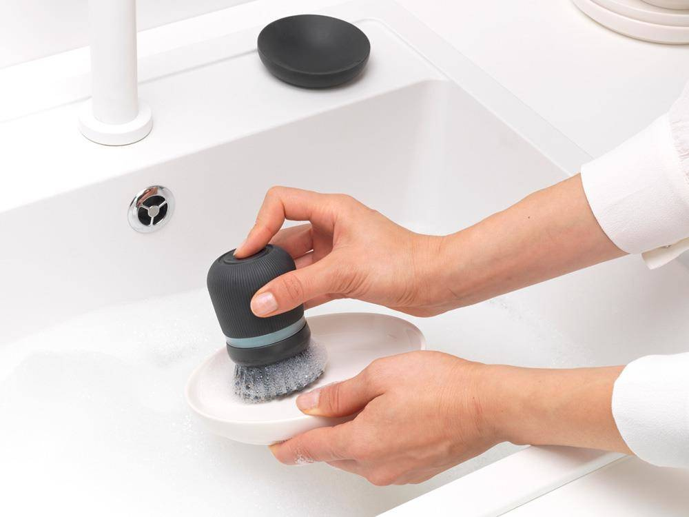 Produkt posiada wygodny uchwyt, zbiornik płynu do mycia naczyń, ergonomiczną szczotkę oraz antypoślizgowy uchwyt, ułatwiający pracę nawet gdy jest mokry. Dzięki dużemu otworowi, napełnianie płynem jest wygodniejsze, z podstawka zabezpiecza blat przed namoknięciem.