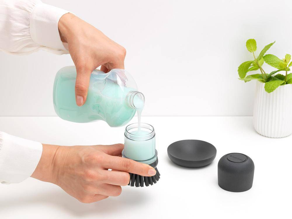 Dzięki tej szczoteczce z dozownikiem do mydła zmywanie naczyń jest łatwe i przyjemne! Naciśnij przycisk, aby uwolnić odpowiednią ilość płynu do mycia naczyń. Trwałe, nylonowe włosie jest wystarczająco mocne, aby szorować, ale wystarczająco miękkie, aby nie rysować powierzchni. Produkt posiada wygodny uchwyt, zbiornik płynu do mycia naczyń, ergonomiczną szczotkę oraz antypoślizgowy uchwyt, ​​ułatwiający pracę nawet gdy jest mokry. Dzięki dużemu otworowi, napełnianie płynem jest wygodniejsze, z podstawka zabezpiecza blat przed namoknięciem. Posiada 5-letnią gwarancję.