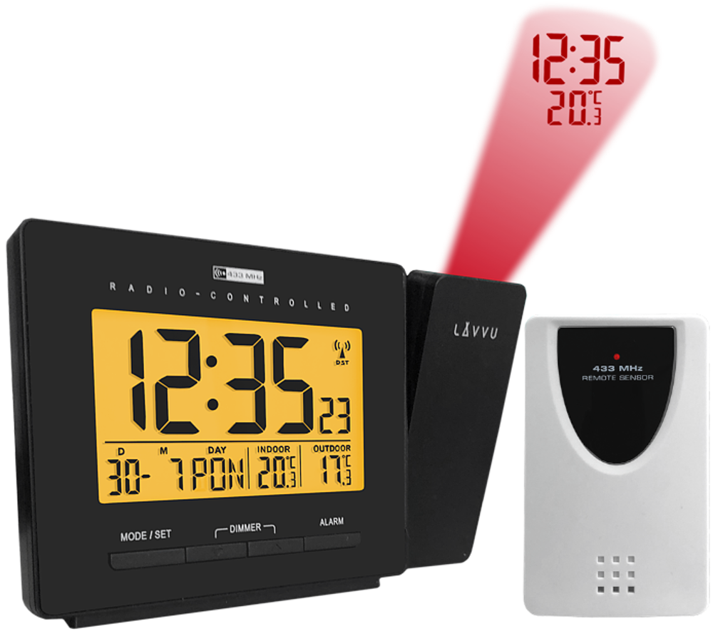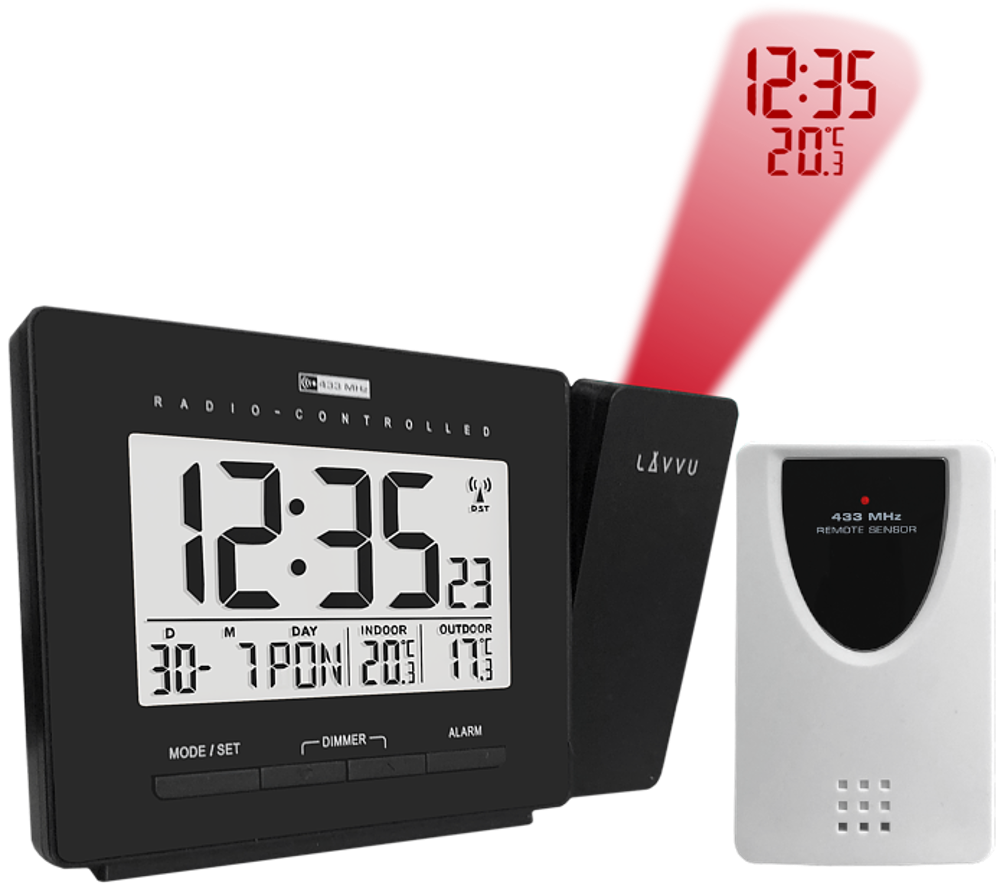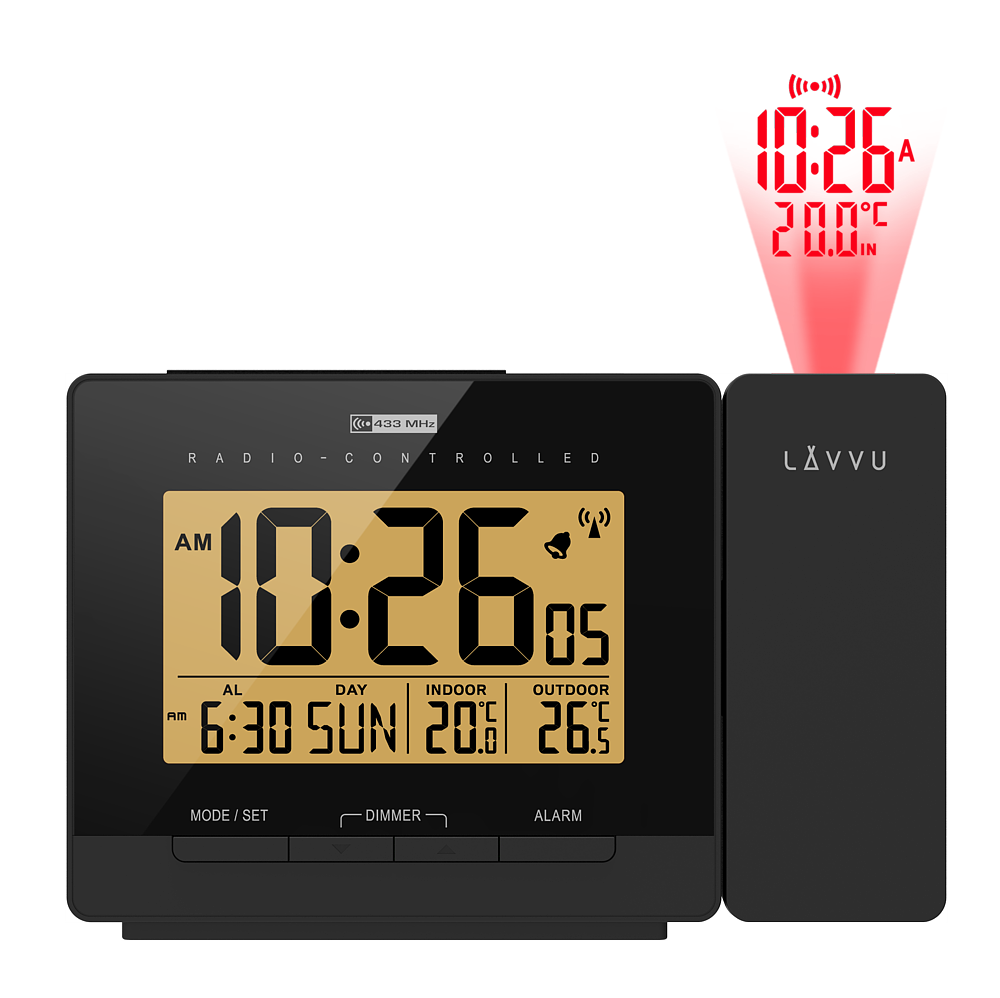 Nowoczesny budzik cyfrowy LAVVU PROJECTION posiada tak wiele przydatnych funkcji, że nagle stanie się Twoim ulubionym towarzyszem na nocnym stoliku. Do jego największych zalet należy czas sterowany radiowo, dzięki czemu budzik jest absolutnie dokładny i automatycznie ustawia się w ciągu dnia zgodnie z sygnałem z Niemiec. Dodatkowym atutem jest nie tylko wskaźnik temperatury pokojowej w zakresie od -10 ° C do 50 ° C, ale przede wszystkim czujnik temperatury zewnętrznej, dzięki któremu od razu po przebudzeniu się dowiesz jaka jest temperatura za oknem w zakresie od -20 ° C do 50 ° C .