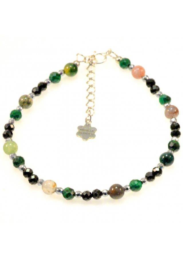 Bransoletka wykonana ze srebra próby 925 , pozłacanego 24 karatowym złotem Kamień: Malachit, Agat i Spinel Rozmiar kamienia: 2mm / 3mm / 4mm Długość: 17,5 cm + przedłużka do 19,5 cm