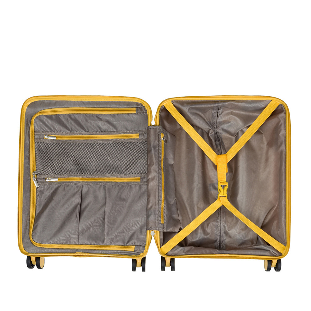 • walizka twarda wykonana z polipropylenu, materiału charakteryzującego się super lekką wagą i niezwykłą wytrzymałością