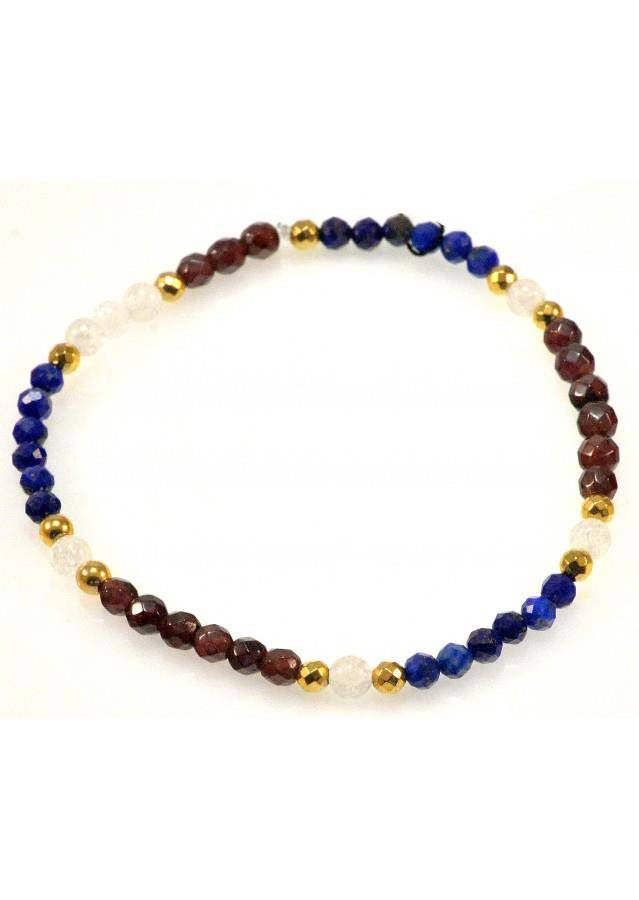 Bransoletka wykonana ze srebra próby 925, pozłacanego 24 karatowym złotem. Kamień: Granat, Lapis, Kryształ Górski i Hematyt Rozmiar kamienia: 3mm Długość: 17,5 cm + przedłużka do 19,5 cm Zapięcie: gumka Biżuteria ręcznie wykonana, produkt Polski.