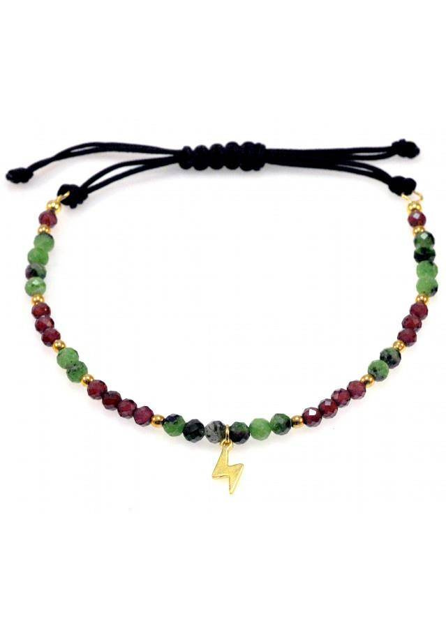 Bransoletka wykonana ze srebra próby 925, pozłacanego 24 karatowym złotem. Kamień: Granat, Turmalin i Hematyt Rozmiar kamienia: 3mm Długość: 17,5 cm + przedłużka do 19,5 cm Zapięcie: makrama Biżuteria ręcznie wykonana, produkt Polski.