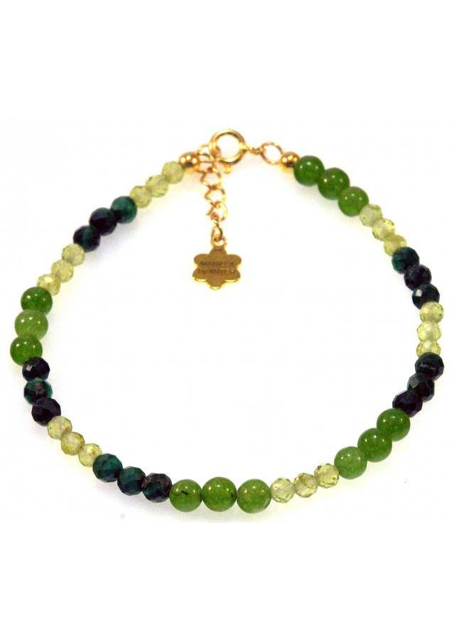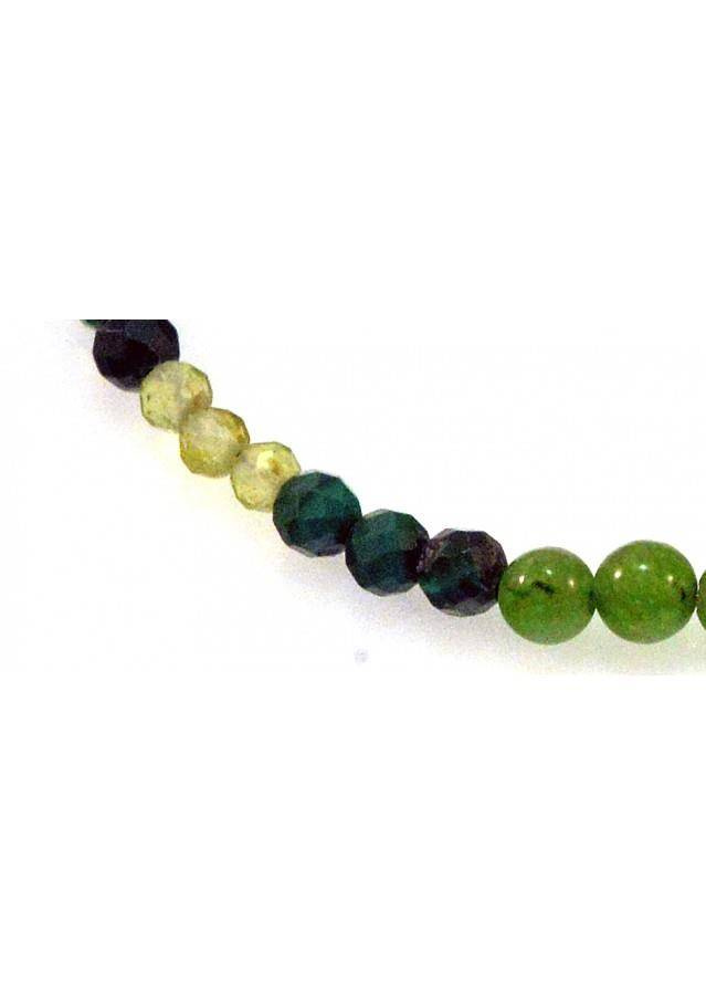 Kamień: Diopsyd, Jadeit, Malachit Rozmiar kamienia: 3mm Długość: 17,5 cm + przedłużka do 19,5 cm Zapięcie: klasyczne (federing) Biżuteria ręcznie wykonana, produkt Polski.