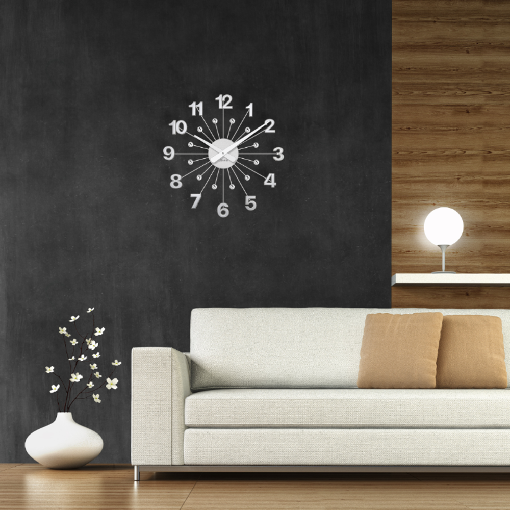 Środek zegara jest wykonany z litego drewna. Dołączają do niego nowoczesne metalowe szprychy w kształcie słońca, z charakterystycznymi plastikowymi cyframi w tym samym odcieniu i prawdziwymi szlifowanymi szklanymi kamieniami na końcu. Zegar jest napędzany przez wysokiej jakości niemiecki mechanizm UTS.