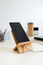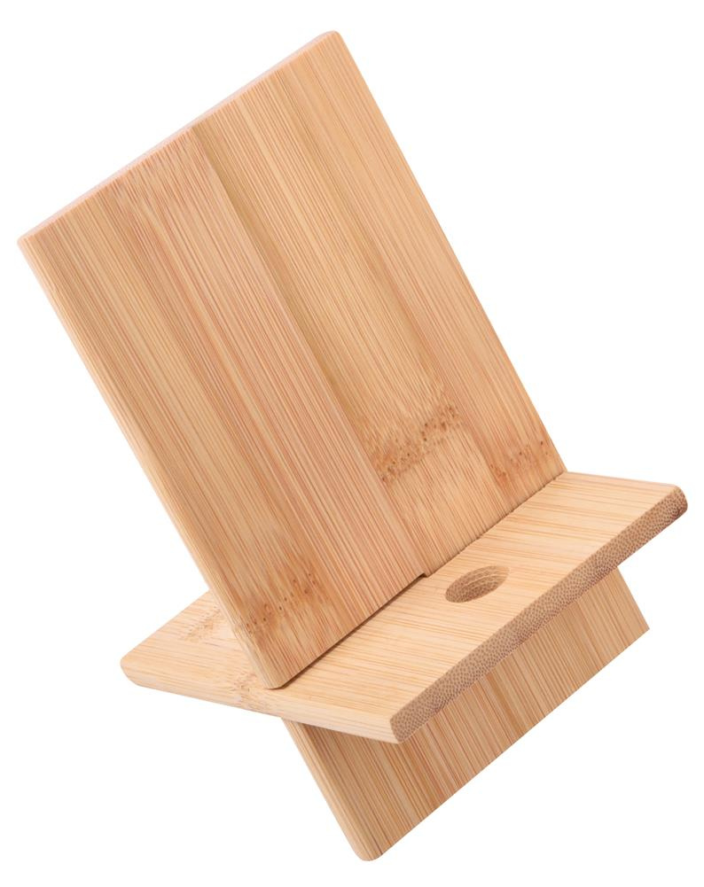 Stojak na smartfon BAMBOO CHAIR: dwuczęściowy, składany, kabel lądujący można przełożyć przez otwór w dolnej części stojaka