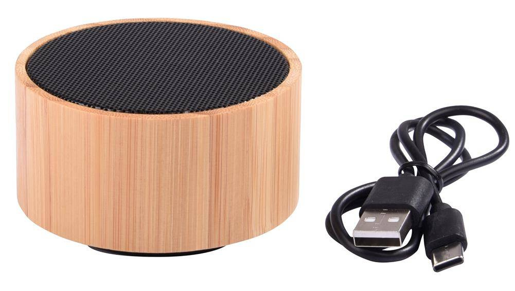 Głośnik bezprzewodowy BAMBOO SOUND z zewnątrz pokryty bambusem. Moc muzyczna 3 W, zasięg ok. 10 m, do parowania z telefonem komórkowym, odtwarzaczem MP3 lub tabletem. Gniazdo na karty microSD, funkcja głośnomówiąca, moc wejściowa 5V/0,5A, zintegrowany akumulator 300mAh, antypoślizgowa podstawa. W zestawie kabel ładujący USB typu C o długości ok. 50 cm.