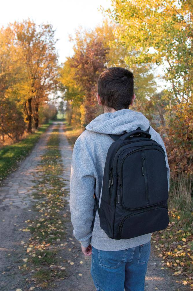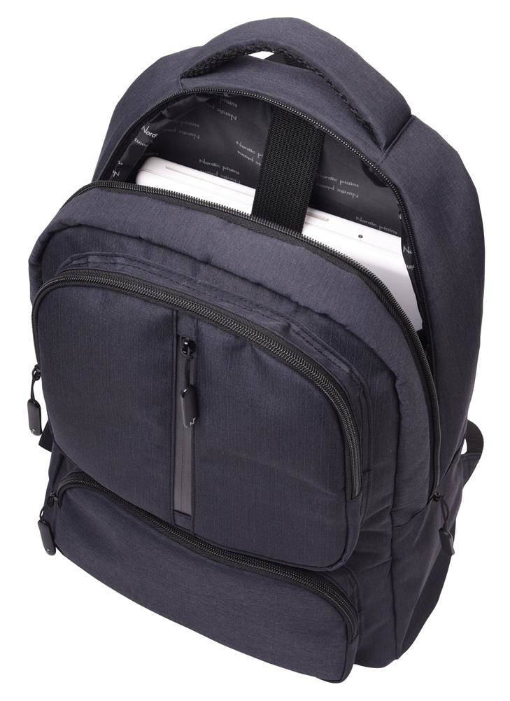 Plecak AMSTERDAM z komorą główną oraz 2 przednimi kieszeniami zamykanymi na zamek błyskawiczny. Z wewnętrzną, wyściełaną kieszenią na laptopa lub tablet oraz organizerem z 5 kieszeniami. Pętla do mocowania, wyściełany uchwyt do przenoszenia, wyściełane ergonomiczne szelki i obszar pleców. Pas bagażowy do mocowania umieszczony na plecach. Produkt marki NORDIC PLAINS.