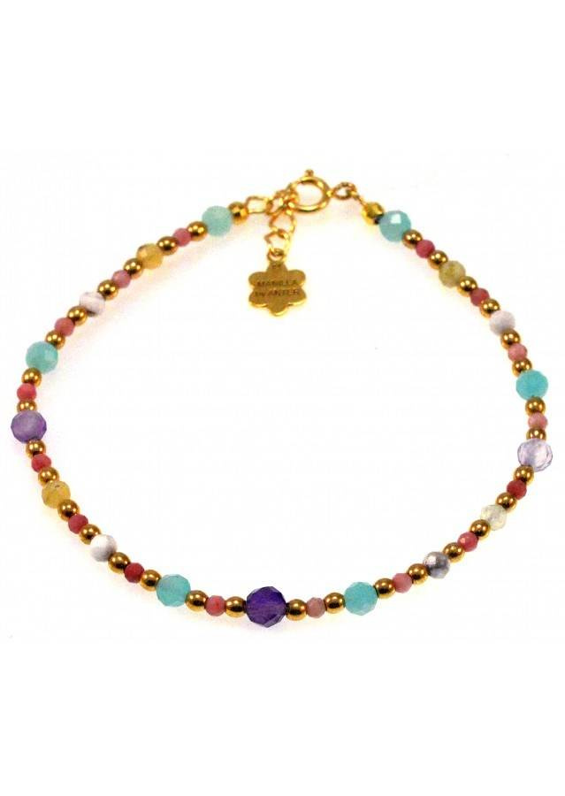 Kamień: Ametyst, Amazonit, Rodonit i Hematyt Rozmiar kamienia: 2mm / 3mm Długość: 17,5 cm + przedłużka do 19,5 cm Zapięcie: klasyczne (federing) Biżuteria ręcznie wykonana, produkt Polski.