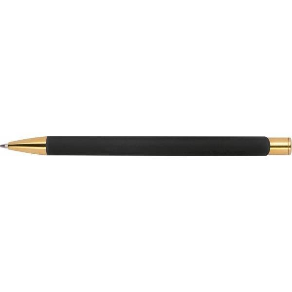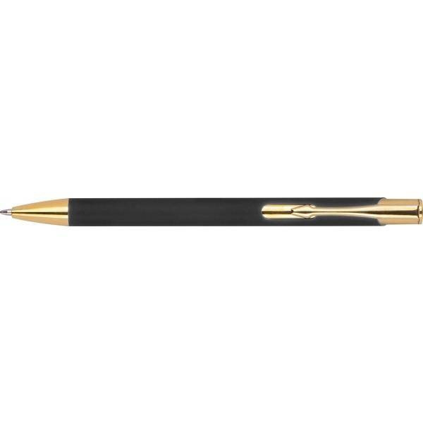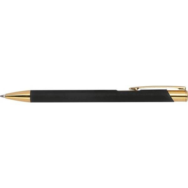 Długopis metalowy soft touch ze złotymi elementami i wkładem piszącym na niebiesko.