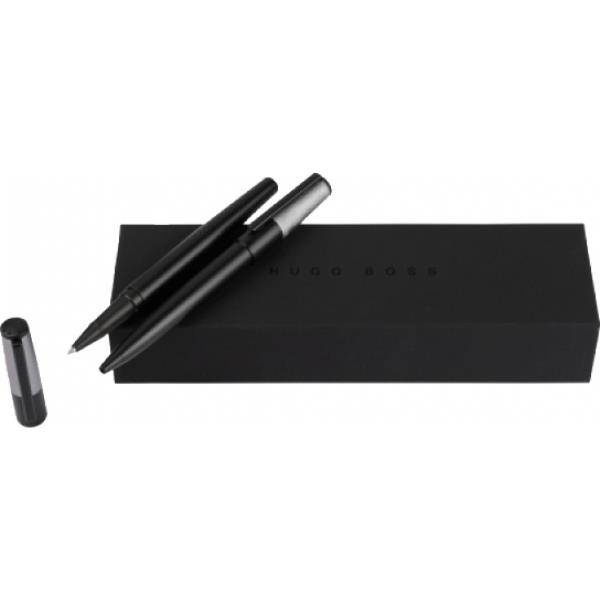 Ten zestaw do pisania oferowany łączy w sobie mieszankę faktur i odcieni, od szczotkowanego chromowanego wykończenia po gładką i miękką czarną powłokę.