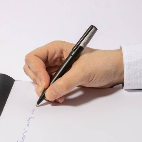 Ten element do pisania to mieszanka faktur i odcieni, od szczotkowanego chromowanego wykończenia po gładką i miękką czarną powłokę.