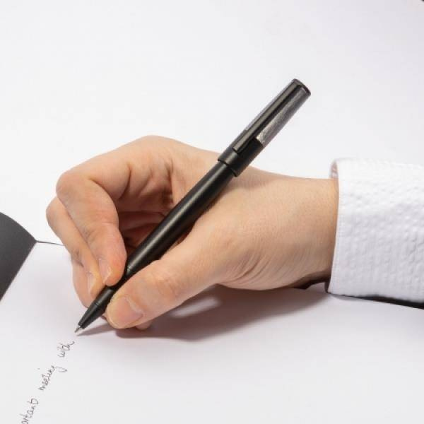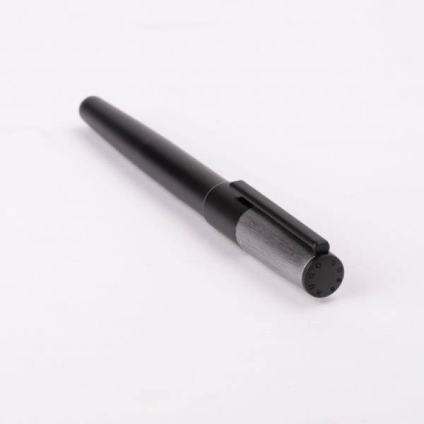 Ten element do pisania to mieszanka faktur i odcieni, od szczotkowanego chromowanego wykończenia po gładką i miękką czarną powłokę.