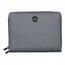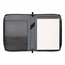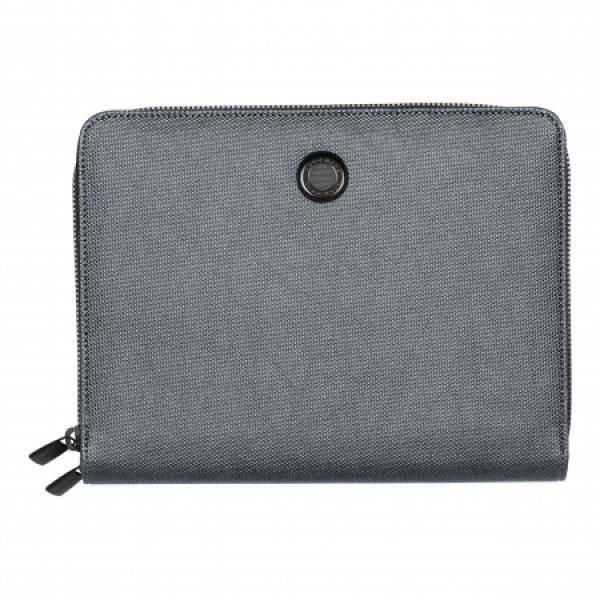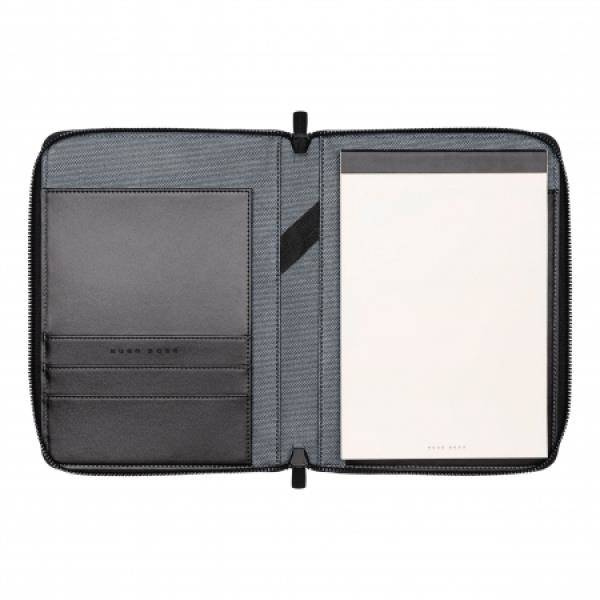 Elegancka teczka konferencyjna od Hugo Boss, w szarej oprawie o ziarnistej fakturze, zamykana na zamek.