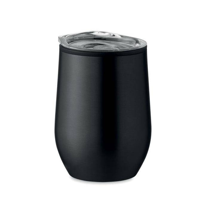 Dwuścienny kubek ze stali nierdzewnej z wewnętrznym PP i przezroczystą pokrywką z PS.