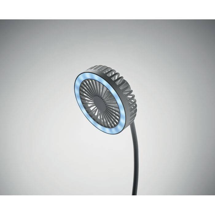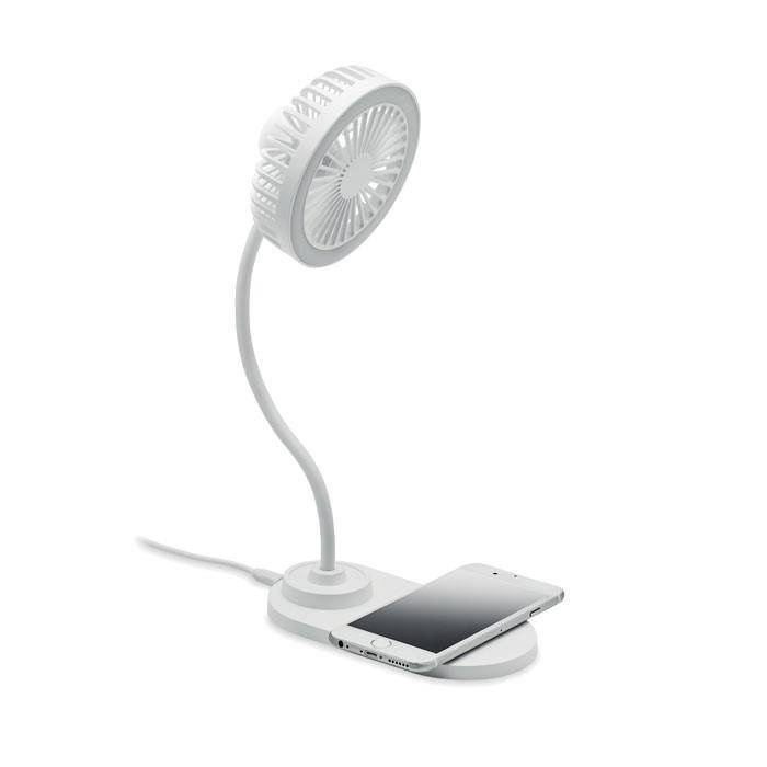 Biurkowy wentylator z ABS z 3 poziomami prędkości, z lampą LED (80 lumenów) i z bezprzewodową ładowarką 10W.