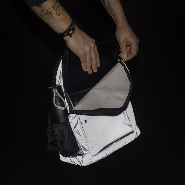 Plecak wykonany z odblaskowego materiału.