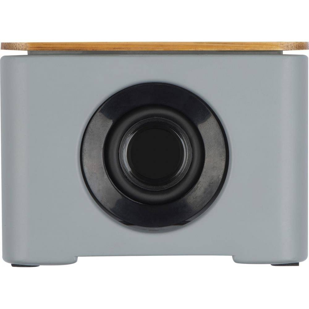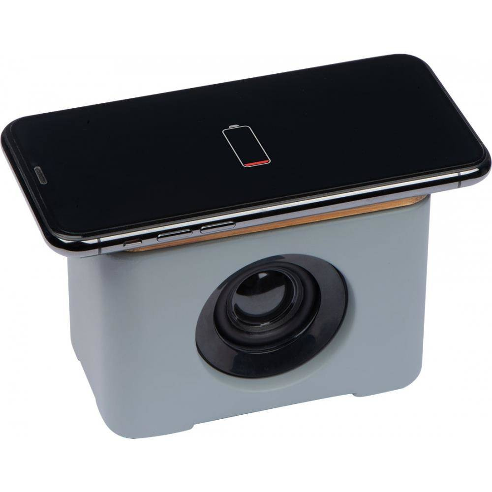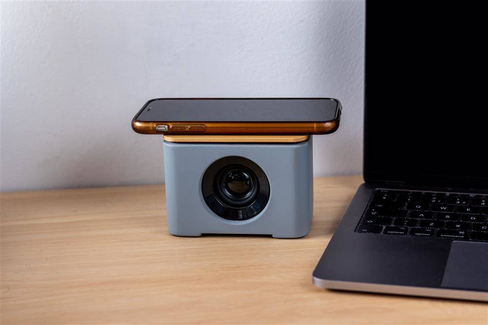 Głośnik Bluetooth z cementu wapiennego. W bambusowej części znajduje się zintegrowana ładowarka indukcyjna.