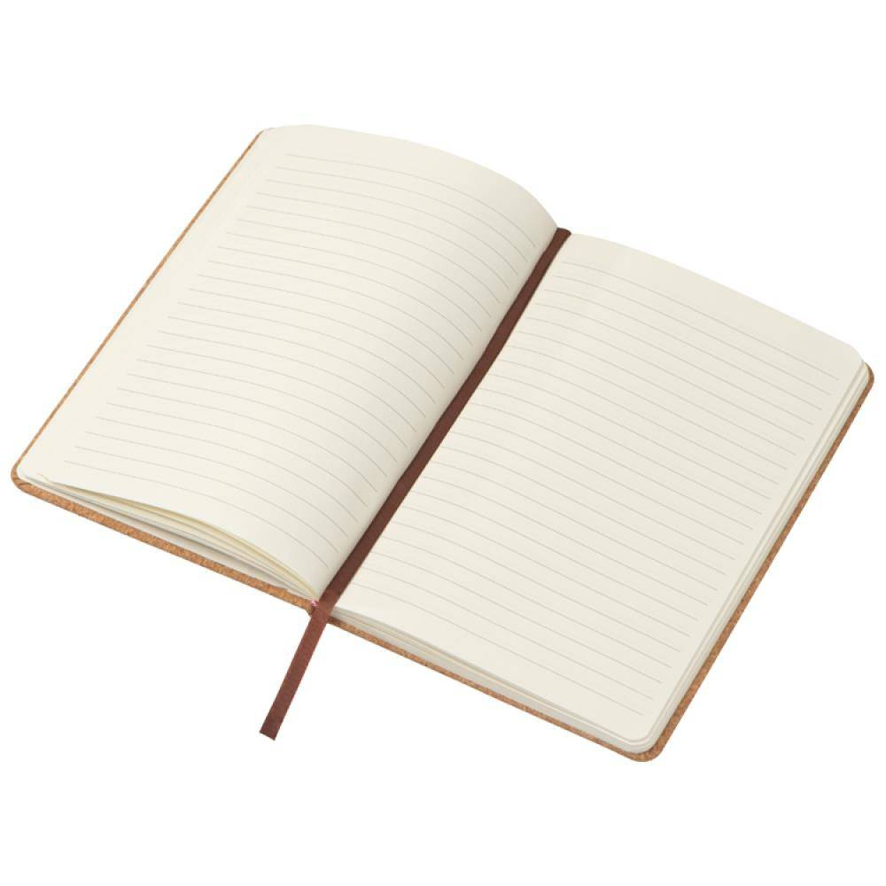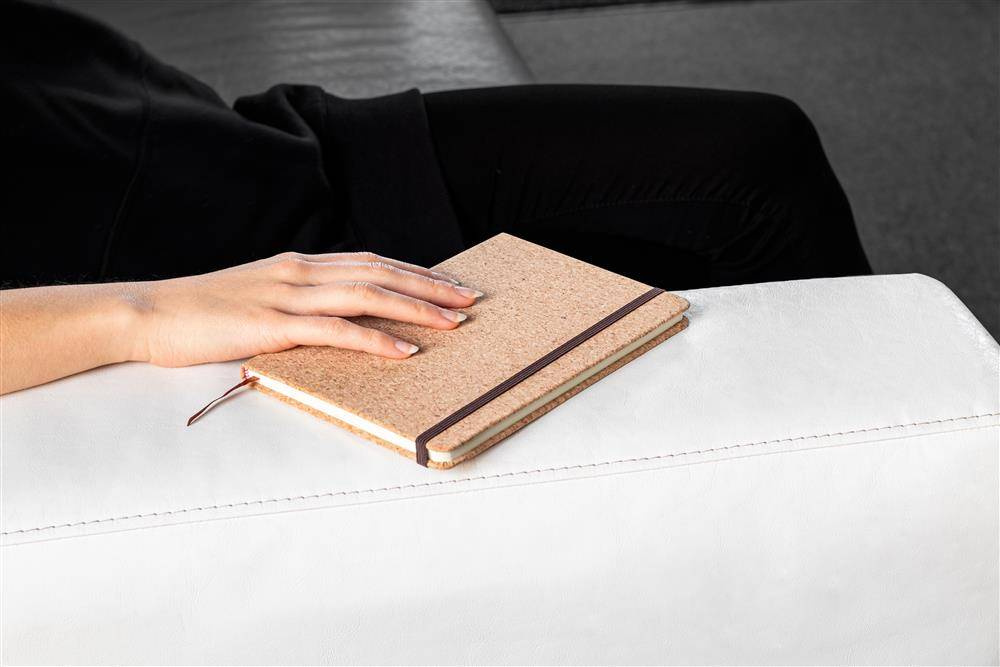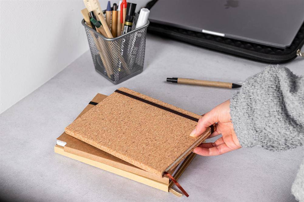 Notes format A5 (160 stron w linie) z okładką wykonaną z korka oraz zakładką i gumką do zamykania.