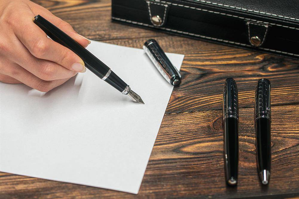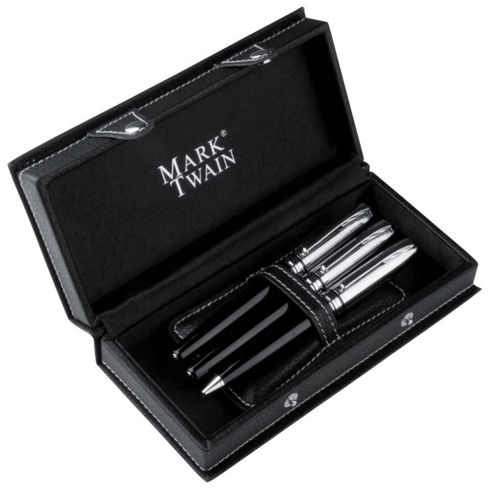 Zestaw piśmienny marki Mark Twain składający się z pióra wiecznego z nabojem, długopisu piszącego na czarno oraz pióra kulkowego piszącego na niebiesko.