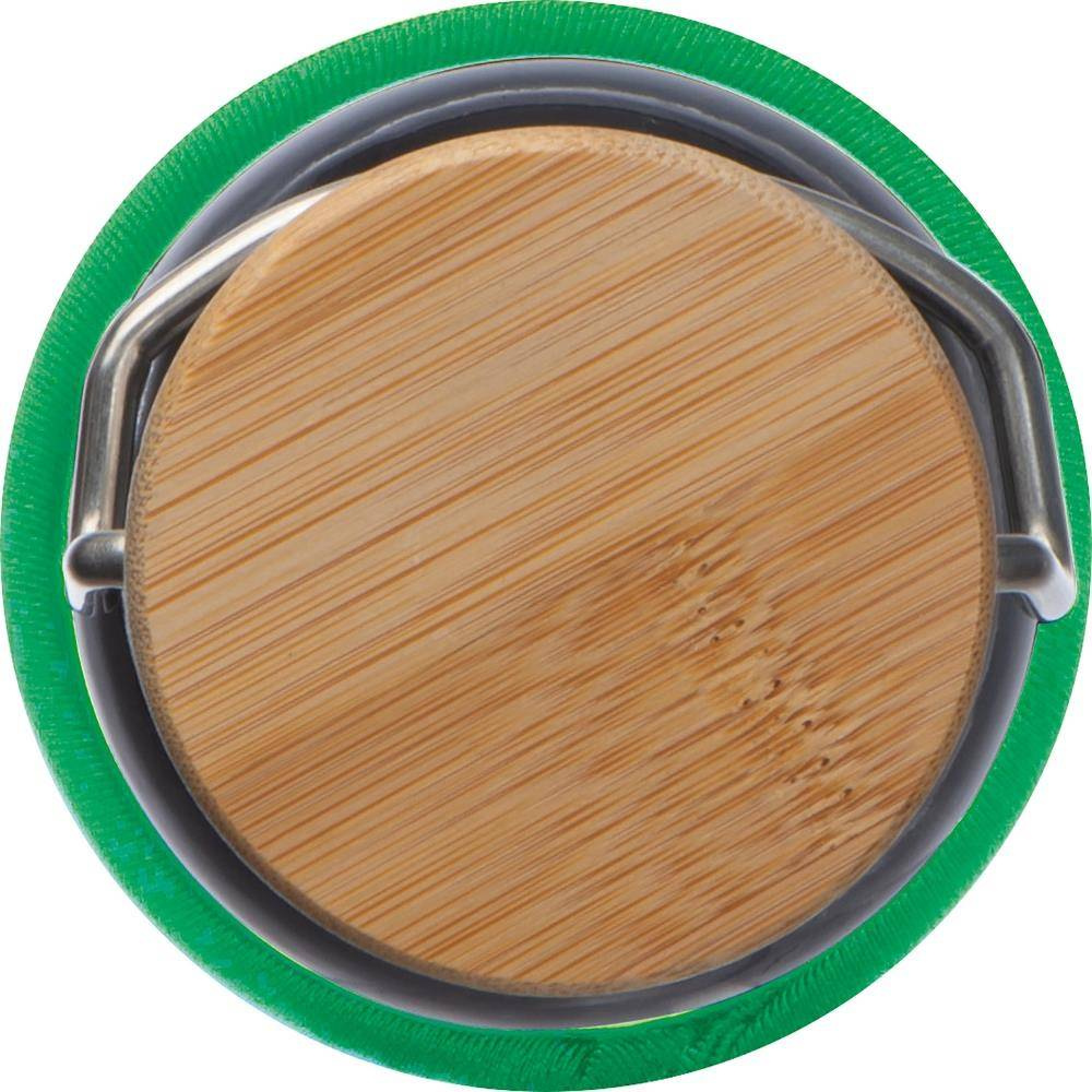 Szklana butelka o pojemności 600 ml, z pokrywką ze stali nierdzewnej i bambusowym zamknięciem.