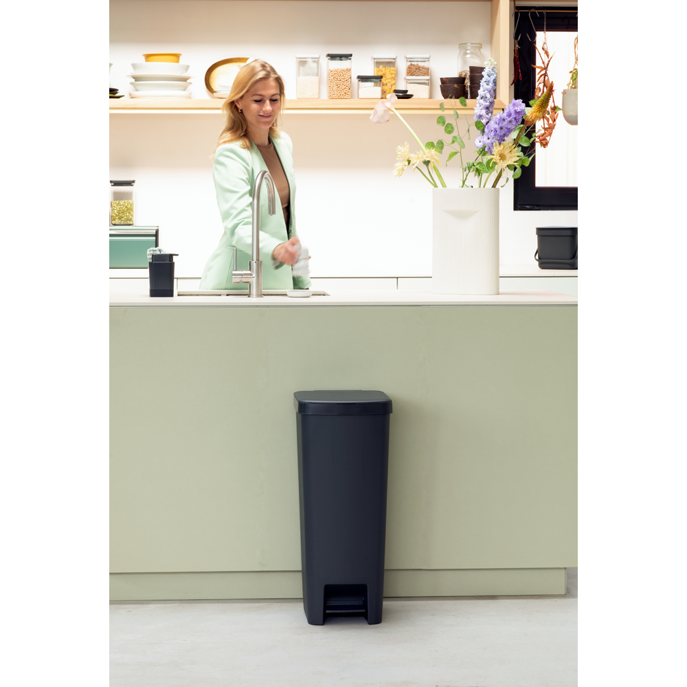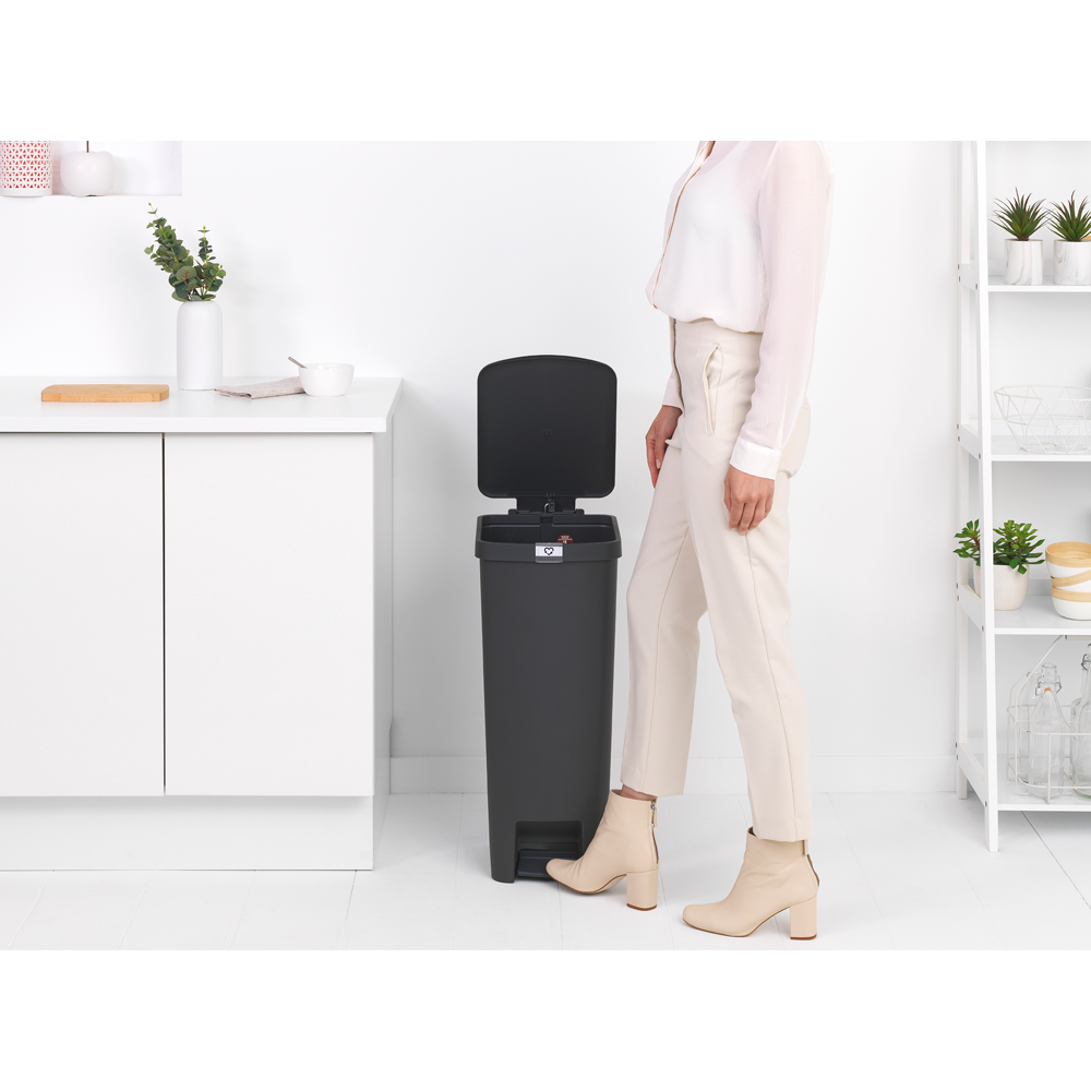 Przyspiesz recykling dzięki koszowi Brabantia StepUp 40L! Wykonane w 91% z odpadów pochodzących z recyklingu i przeznaczonych do recyklingu! Z zatrzaskowym uchwytem na etykiety i poręcznym schowkiem na worki wewnątrz kosza. Jeśli kochasz recykling, z pewnością pokochasz ten kosz.