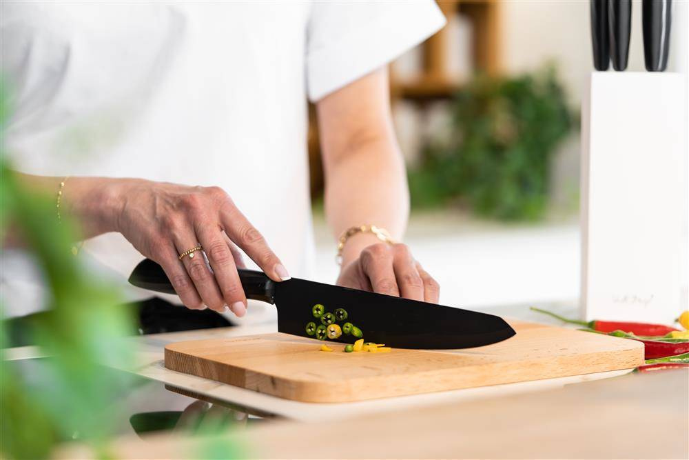 Zestaw 5 noży w czarnym bloku CARO kuchni musi być ostro – zarówno pod względem smaku, jak i jakości noży. Blok 5 noży CARO to Twój wymarzony towarzysz kulinarnych podróży. Ostre krawędzie tnące pozwolą Ci kroić i obierać nawet najbardziej wymagające produkty. Wszystko dzięki wysokiej klasy niemieckiej stali 1.4116. To standardowa wartość dla nowoczesnych noży kuchennych dobrego gatunku, która umożliwia swobodne użytkowanie bez konieczności ciągłego ostrzenia. Duże znaczenie dla komfortu użytkowania ma twardość stali. Ostrza wchodzące w skład zestawu CARO uzyskały wynik 56 HRC w skali Rockwella. Dzięki temu w razie potrzeby noże możesz łatwo naostrzyć i przygotować do dalszego, równie efektywnego korzystania. Powierzchnię pokryto cienką warstwą ochronną, odporną na warunki panujące w kuchni. Oznacza to, że stal nie zmieni swoich właściwości pod wpływem kontaktu z substancjami obecnymi z żywności. Obok wykonania uwagę zwraca komfortowy i nowoczesny kształt. Noże zaprojektowano tak, by rękojeść nie wyślizgiwała się z dłoni podczas użytkowania. To zwiększa Twoją wygodę podczas przyrządzania potraw. Jakość produktu poświadcza 5-letnia gwarancja. Komplet składa się z 5 wysokogatunkowych ostrzy: nóż szefa kuchni 20 cm, nóż do chleba 20 cm, nóż do mięsa 20 cm, nóż uniwersalny 12,5 cm, nóż do obierania 9 cm. Dodatkowym elementem jest blok, w którym są zlokalizowane noże. W zależności od upodobań i wystroju Twojej kuchni możesz wybrać wariant czarny lub biały. Uniwersalna kolorystyka pozwala wkomponować zestaw w każdy wystrój.