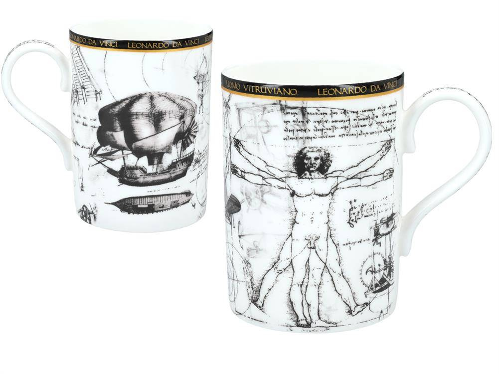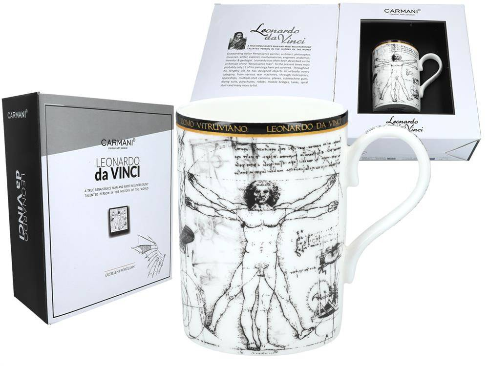 Ten elegancki kubek porcelanowy z reprodukcją obrazu Człowiek Witruwiański Leonarda da Vinci to idealny wybór dla miłośników sztuki i designu.