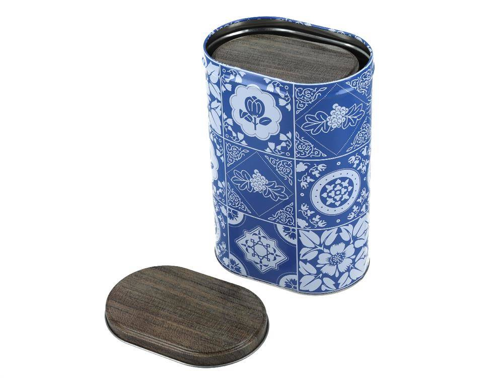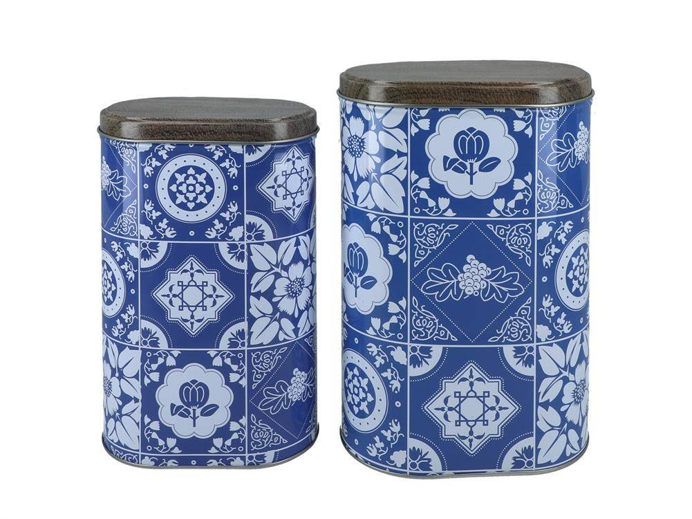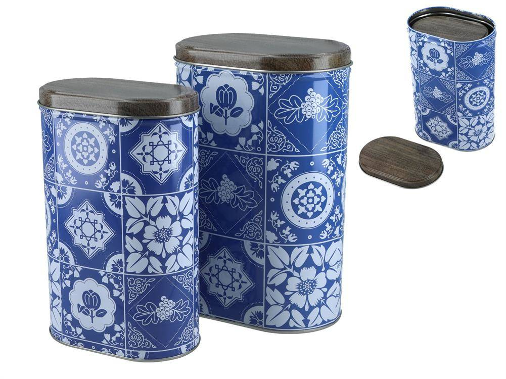 Komplet 2 owalnych, kolorowych puszek świetnie się prezentuje także na otwartych półkach i blatach.