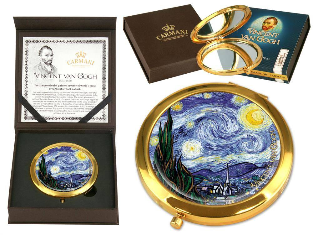 Urocze, małe lustereczko z motywem twórczości Vincenta van Gogha. Doskonałe do każdej kobiecej torebki. Zajmuje mało miejsca a jego piękne zdobienia dodają uroku.