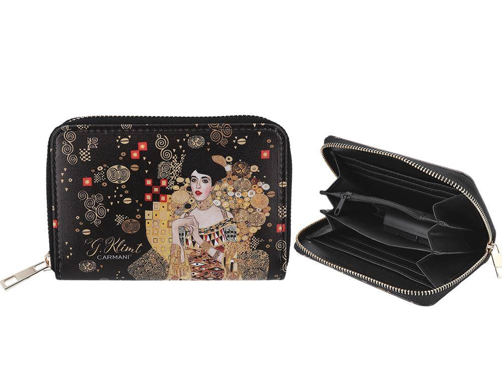 Pięknie ozdobniony portfel na suwak. Posiada przegródki na banknoty, karty płatnicze, wizytówki oraz zamykaną kieszonkę na monety.