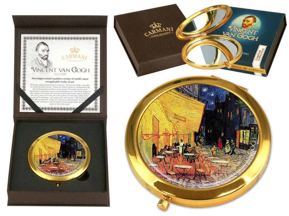 Urocze, małe lustereczko z motywem twórczości Vincenta van Gogha. Doskonałe do każdej kobiecej torebki. Zajmuje mało miejsca a jego piękne zdobienia dodają uroku.