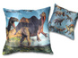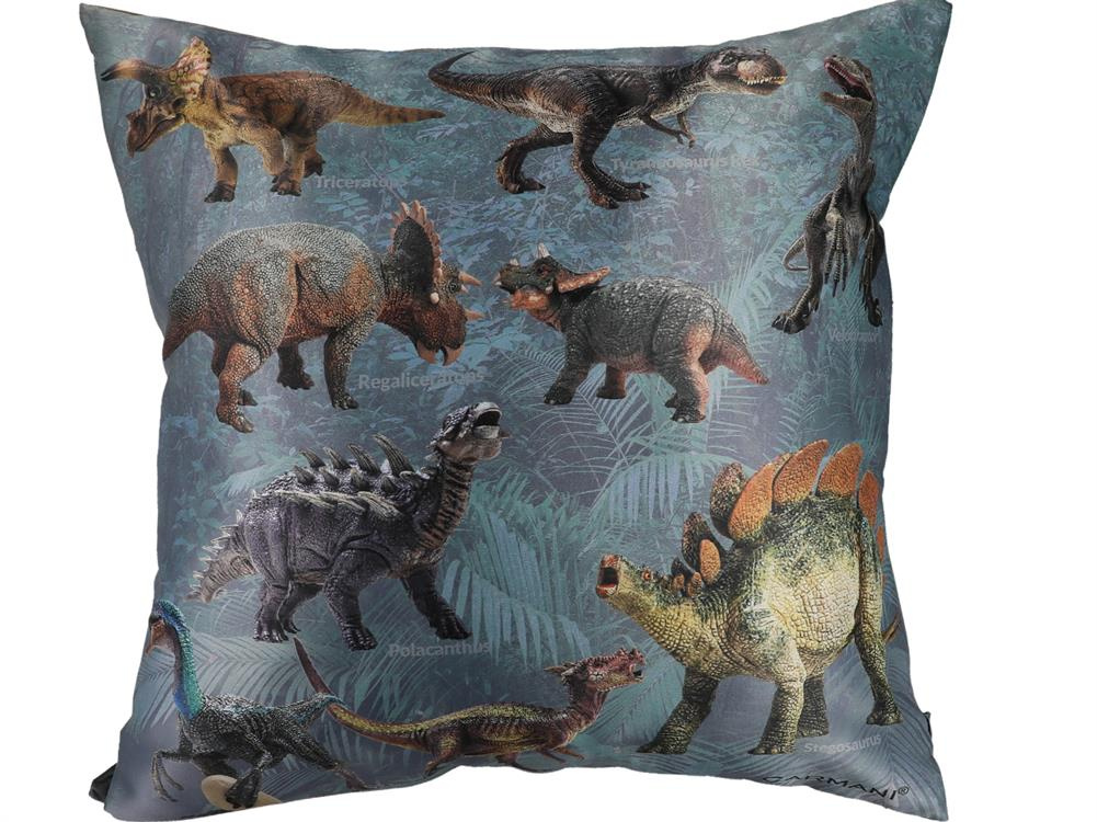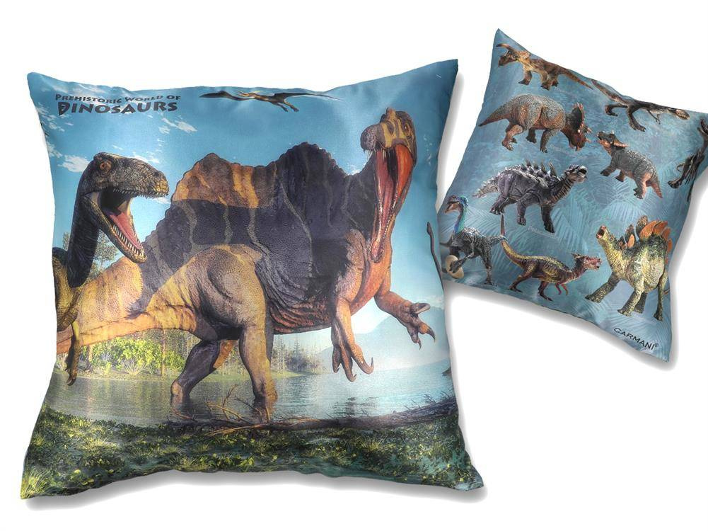 Ładna, wygodna i puszysta poduszka z wizerunkami prehistorycznych dinozaurów. Świetna jako urozmaicenie wznętrza, ale również doskonale wygląda w dziecięcym pokoju.